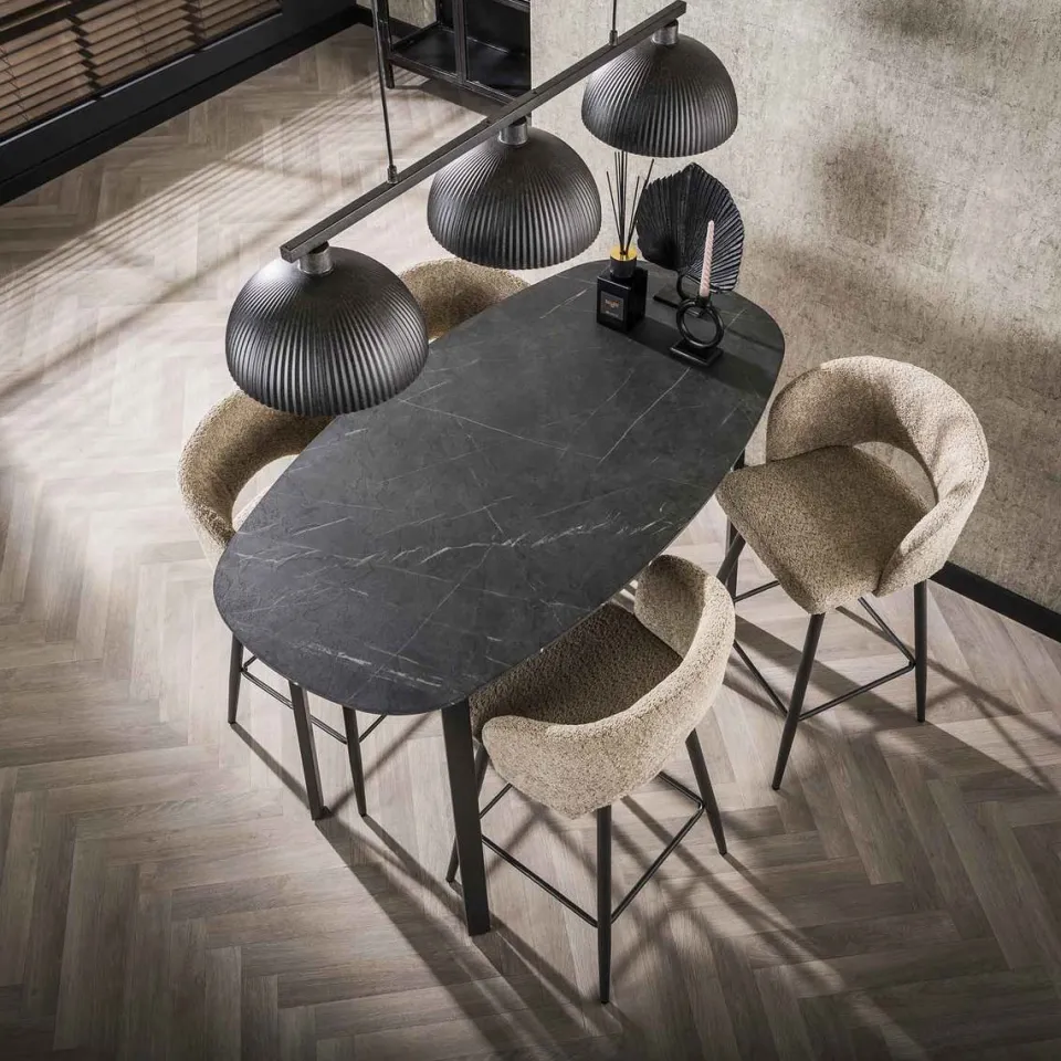 Deze bartafel Monet is uitgevoerd in melamine met een keramiek uitstraling en een rechthoekig frame in staal. De tafel is haast niet te onderscheiden van een keramiek tafel. Het handgemaakte tafelblad met een verjongde rand is voorzien van een laagje melaminehars dat is aangebracht op hout. Het materiaal wordt door hitte en druk aangebracht. Het prachtige materiaal in combinatie met de deens ovale vorm, geeft een trendy, maar tegelijk ook tijdloze tafel.