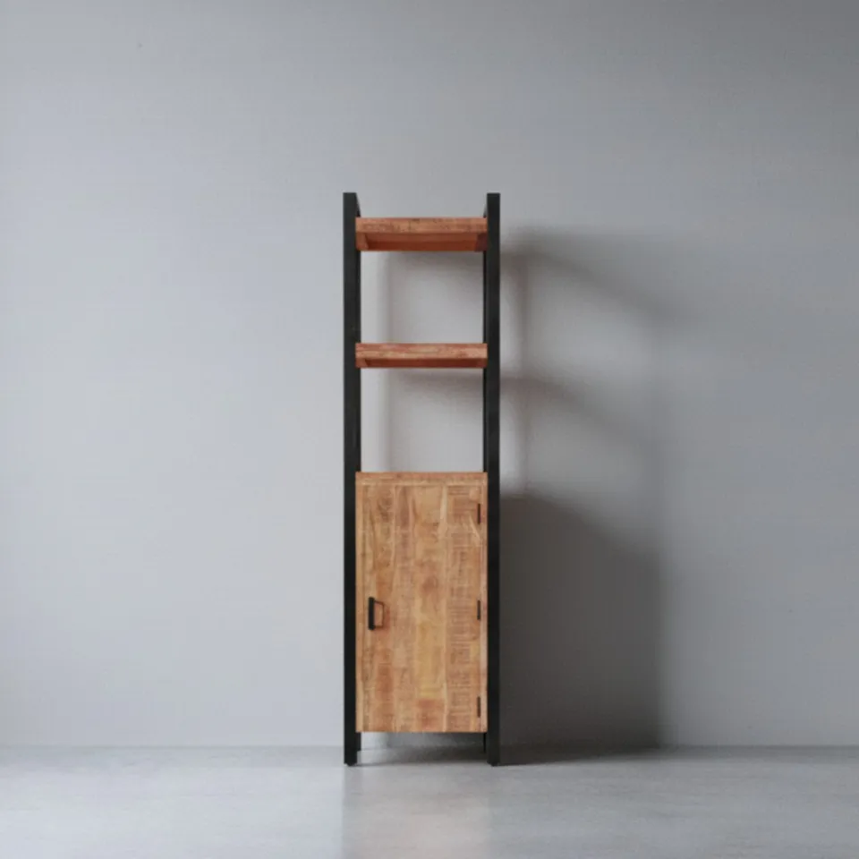 Boekenkast Britt is een stijlvolle en functionele toevoeging aan je interieur, ontworpen voor wie houdt van stoere materialen en een strak lijnenspel. De kast is gemaakt van mango hout in combinatie met zwart metaal, wat zorgt voor een robuuste en industriële uitstraling. De open vakken bieden ruimte voor boeken, decoratie of planten. De kast is verkrijgbaar in twee variaties: met een houten deur voor gesloten opbergruimte of met drie lades voor het opbergen van kleinere items. Boekenkast Britt is onderdeel van de meubelserie Britt, waarmee je eenvoudig een samenhangend interieur creëert.