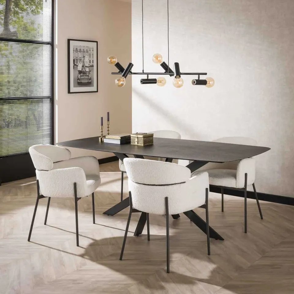 Eetkamerstoel Julliet is een comfortabele armstoel met een verfijnde, moderne uitstraling. De zitting is bekleed met zachte bouclé stof die warmte en textuur toevoegt aan je interieur. De afgeronde vormen van de rugleuning en armleuningen zorgen voor een prettige ondersteuning en een uitnodigende zit. Het zwarte metalen onderstel maakt het ontwerp compleet met een krachtig, stijlvol accent. Julliet is verkrijgbaar in meerdere kleuren.