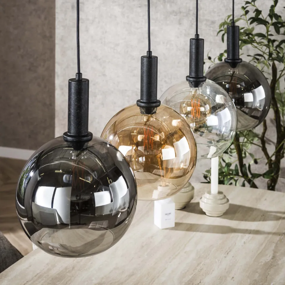 De hanglamp Sjors bestaat uit drie of vier bolvormige glazen kappen in chroom, amber en transparant. Het metalen armatuur en de plafondplaat zijn afgewerkt in een artic black finish. Iedere lamp is afzonderlijk in hoogte verstelbaar tot 150 cm.