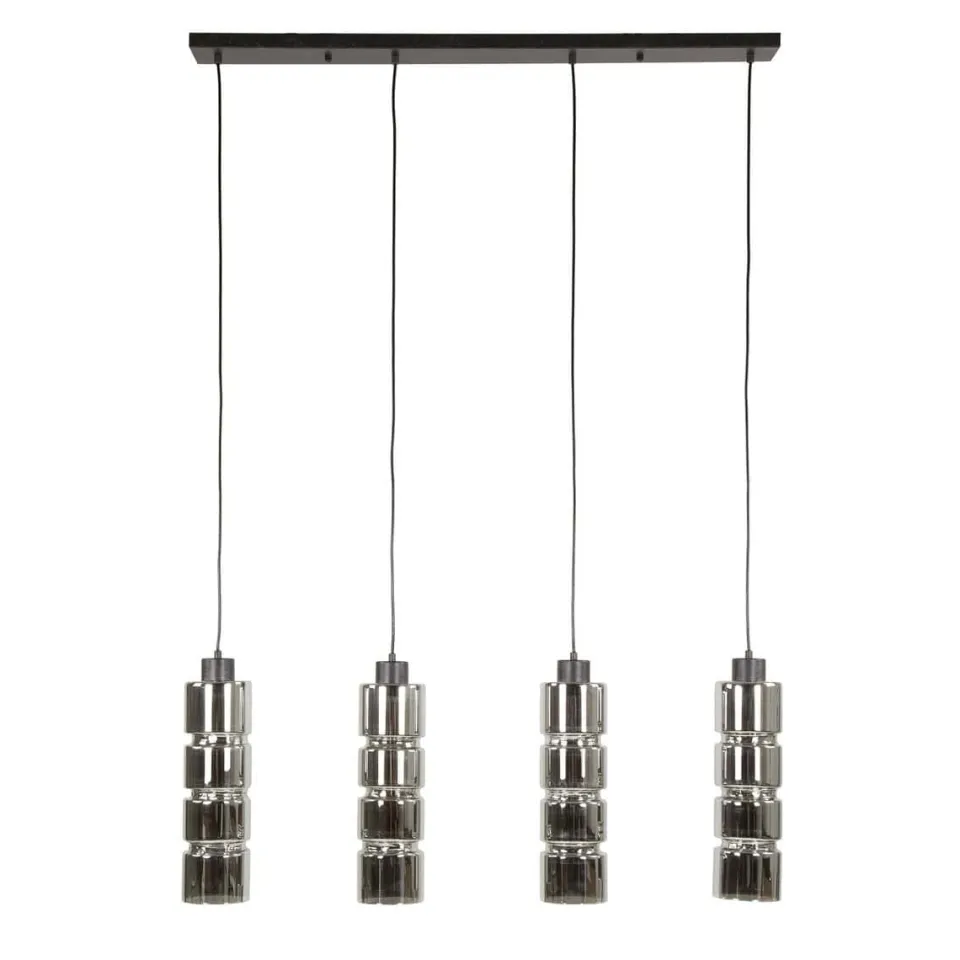 Deze hanglamp is uitgevoerd in metaal met een artic black finish en chrome glazen kappen. De lamp bestaat uit 4 prachtige bewerkte cylinders waardoor de ruimte mooi en gedoseerd verlicht wordt. De kappen zijn ieder afzonderlijk tot 150 cm in hoogte verstelbaar. Deze lamp geeft ieder huis een beetje meer sfeer!