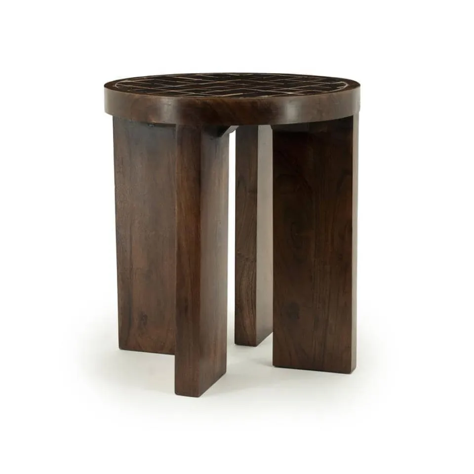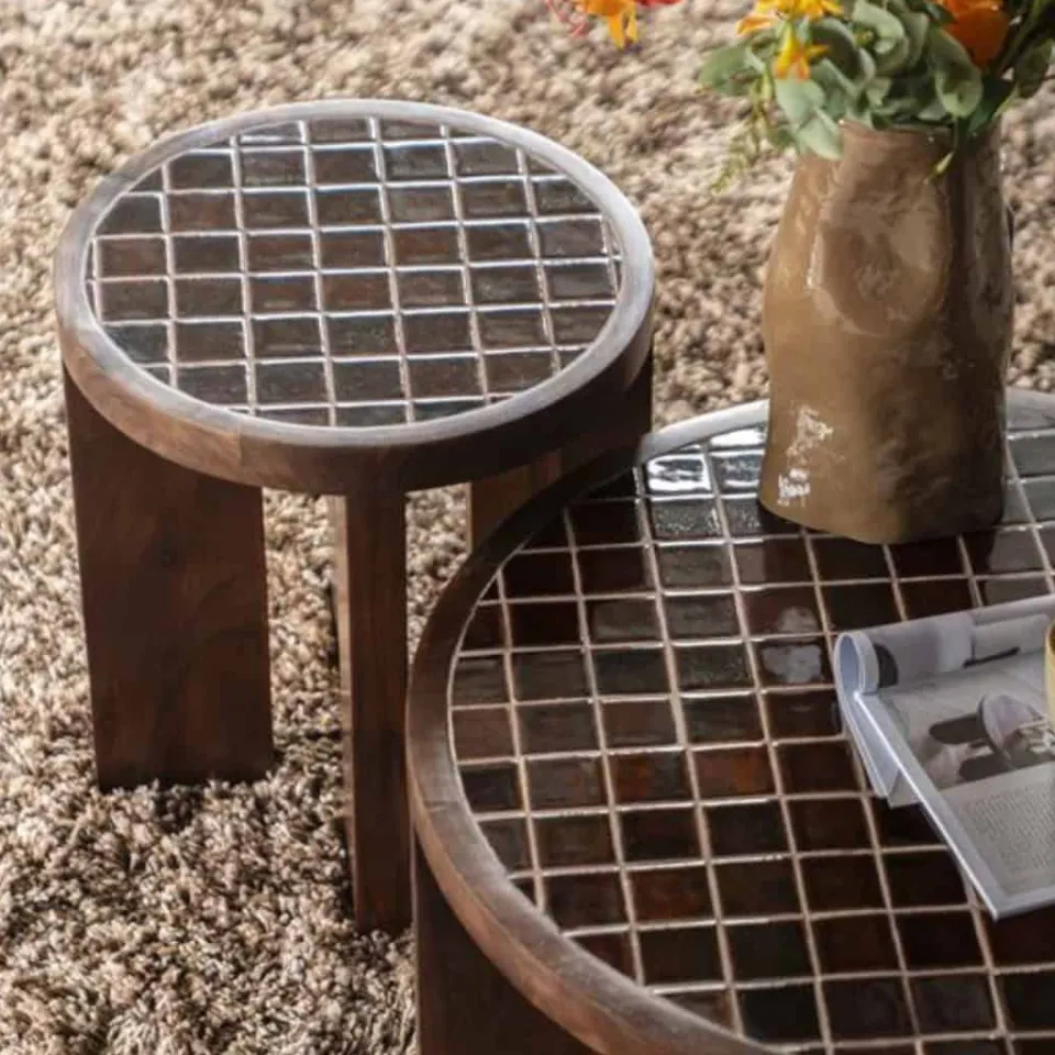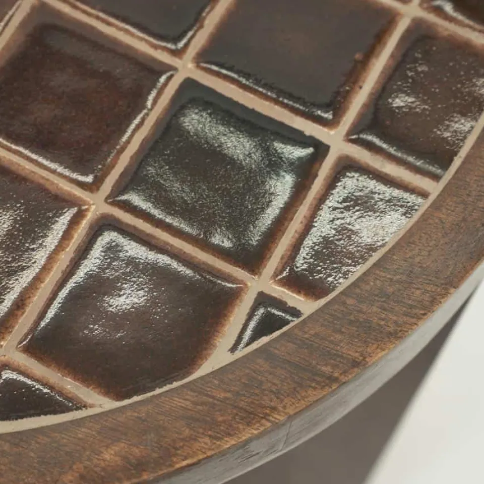 De bijzettafel Tiledup valt meteen op door het bijzondere tafelblad van keramiek met ingelegd tegelpatroon. De combinatie met het warme bruine mangohout zorgt voor een stijlvol én speels geheel.