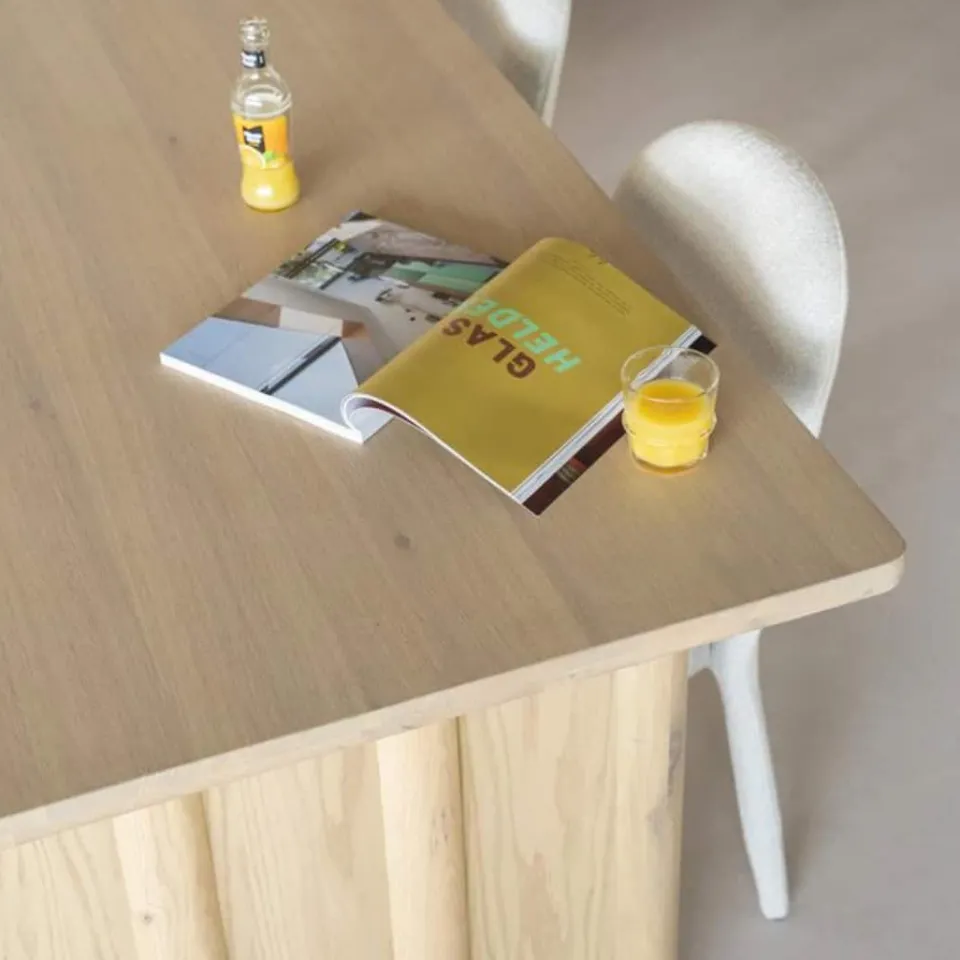Eetkamertafel Jake van Eleonora is een blikvanger met een uniek vormgegeven tafelpoot die direct de aandacht trekt. Gemaakt van eikenhout en verkrijgbaar in de kleuren naturel en bruin, straalt deze tafel warmte en karakter uit. Eettafel Jake is bij HUUS verkrijgbaar in drie formaten: 180 cm, 250 cm en 300 cm — ideaal voor elke eetkamer.