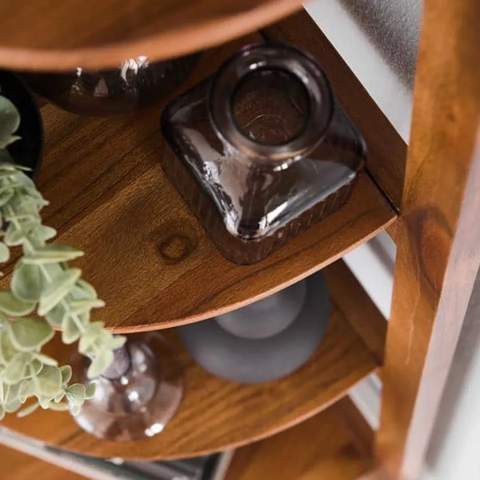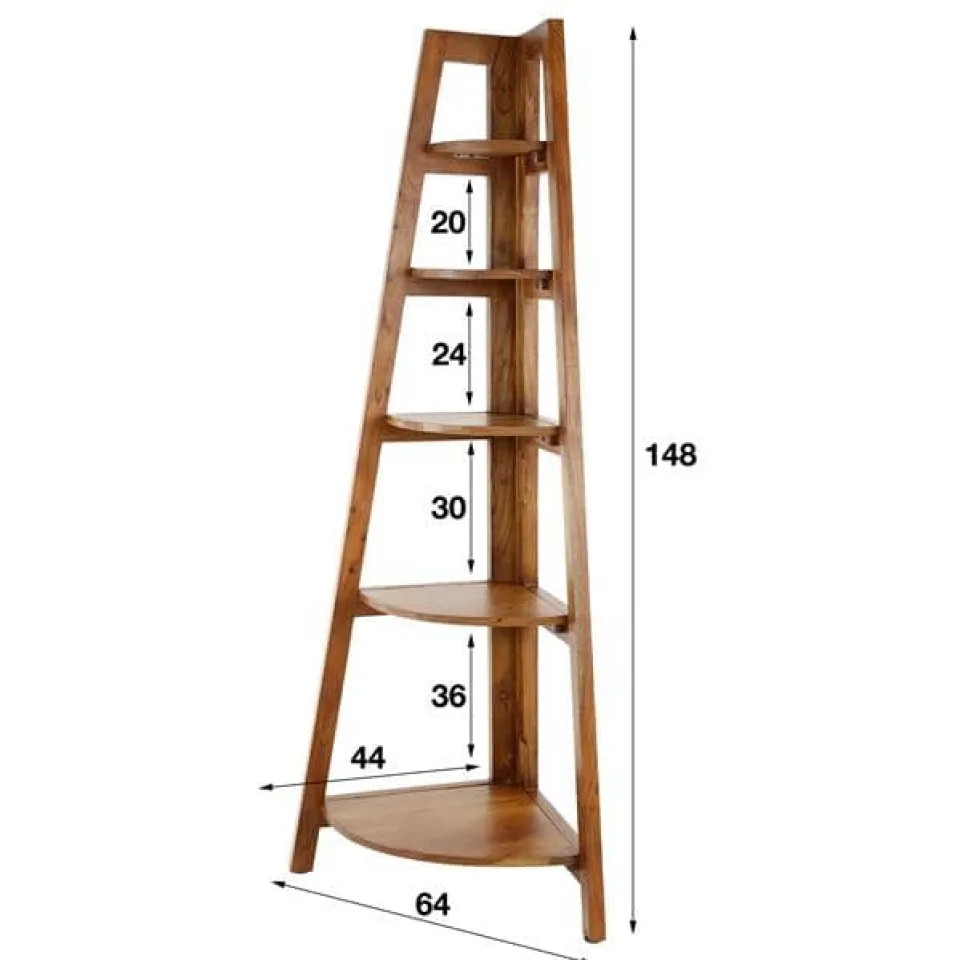 Dit hoekrek is uitgevoerd in mangohout. Het rek beschikt over 5 schapjes. De schapjes beschikken over scharnieren waardoor deze omhoog geklapt kunnen worden wanneer dit nodig mocht zijn. Hierdoor is de verpakking van dit artikel aanzienlijk gereduceerd. Zie hiervoor de foto.