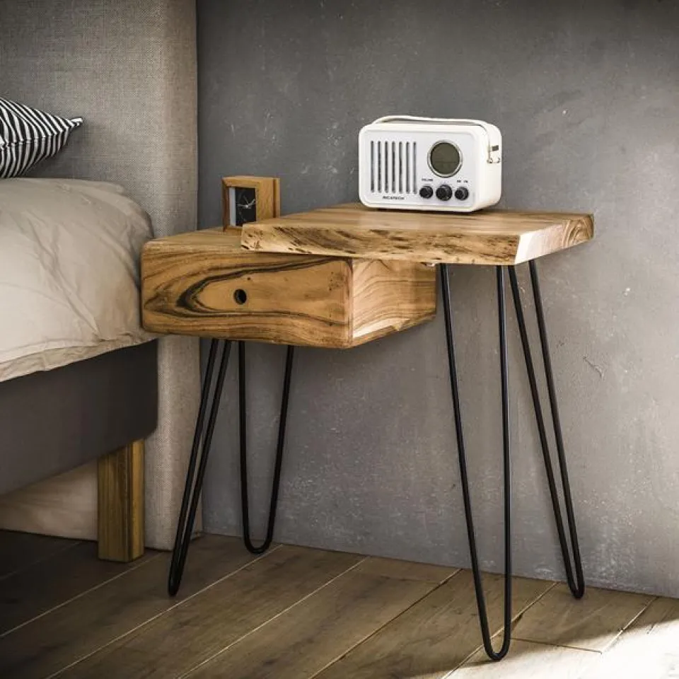 Dit nachtkastje is gemaakt van massief acaciahout. Het kastje heeft een mooie boomstam-vorm, waardoor hij een natuurlijke uitstraling krijgt. Dit model is voorzien van een ladeblok, dat zich bij een vooraanzicht rechts bevindt, en een plateau. Nachtkastje of side table is verder afgewerkt met een ranke poot van gepoedercoat zwart metaal. Deze nachtkastjes zijn leuk te combineren met de sidetable Cady