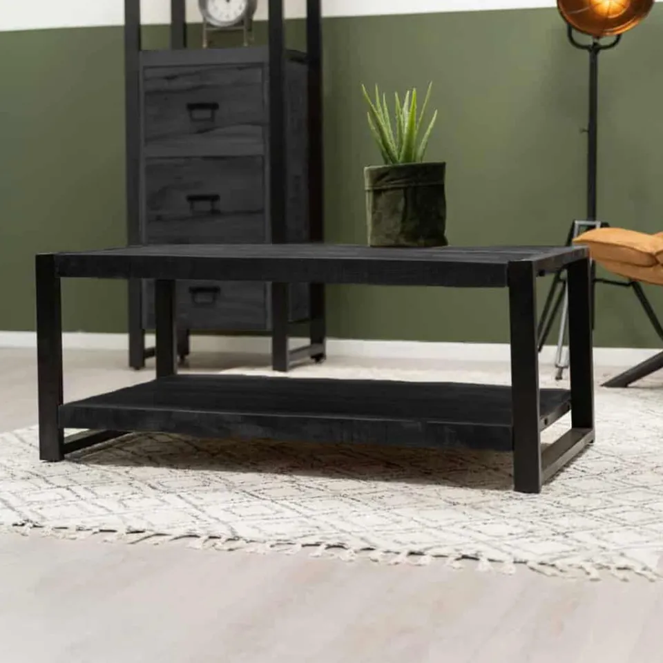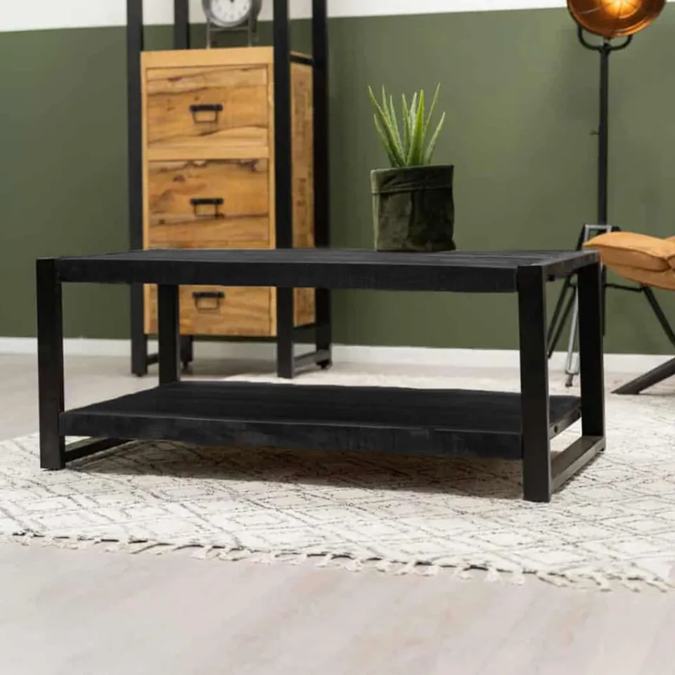Salontafel Britt zwart mangohout metaal HUUS collectie combineert stoer design met warme naturaliteit. Het massieve blad van mangohout is zwart afgewerkt en ondersteund door een stevig metalen frame. Daardoor krijgt deze tafel een krachtige uitstraling. Er zijn drie varianten: standaard, met lades of met extra planken — zodat jij kunt kiezen wat het beste past bij jouw interieur.
