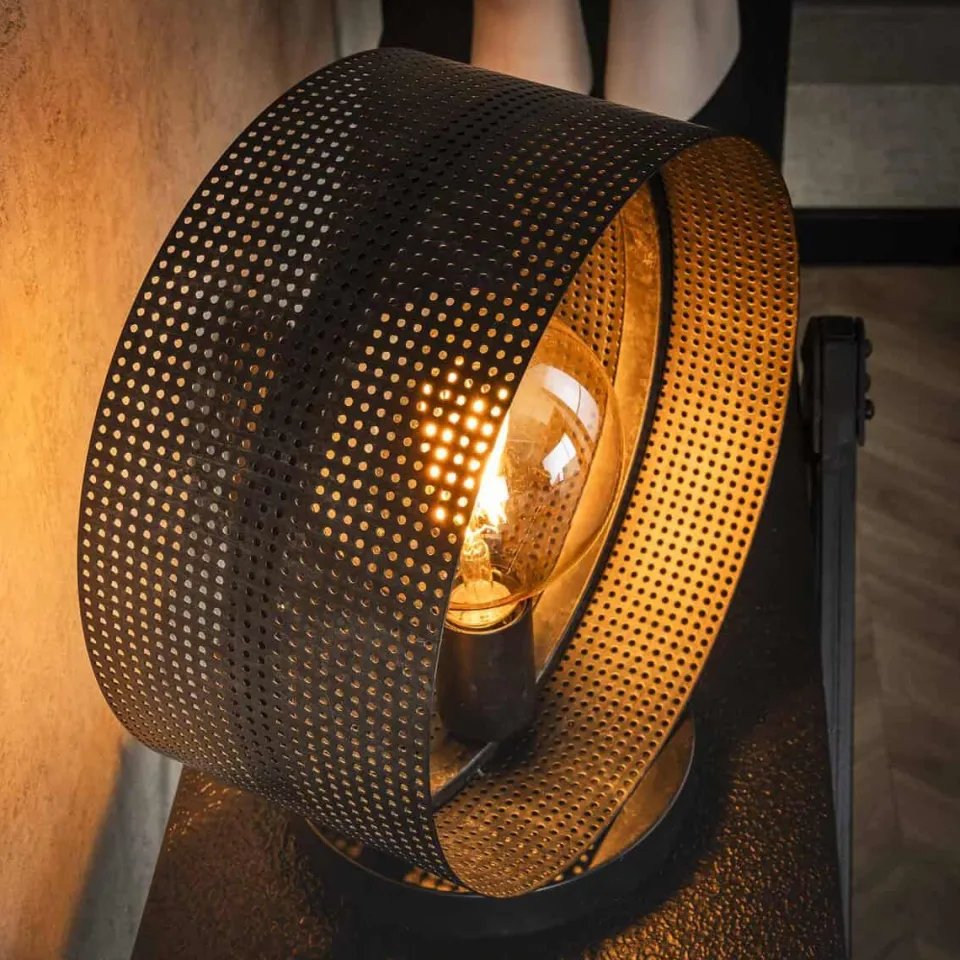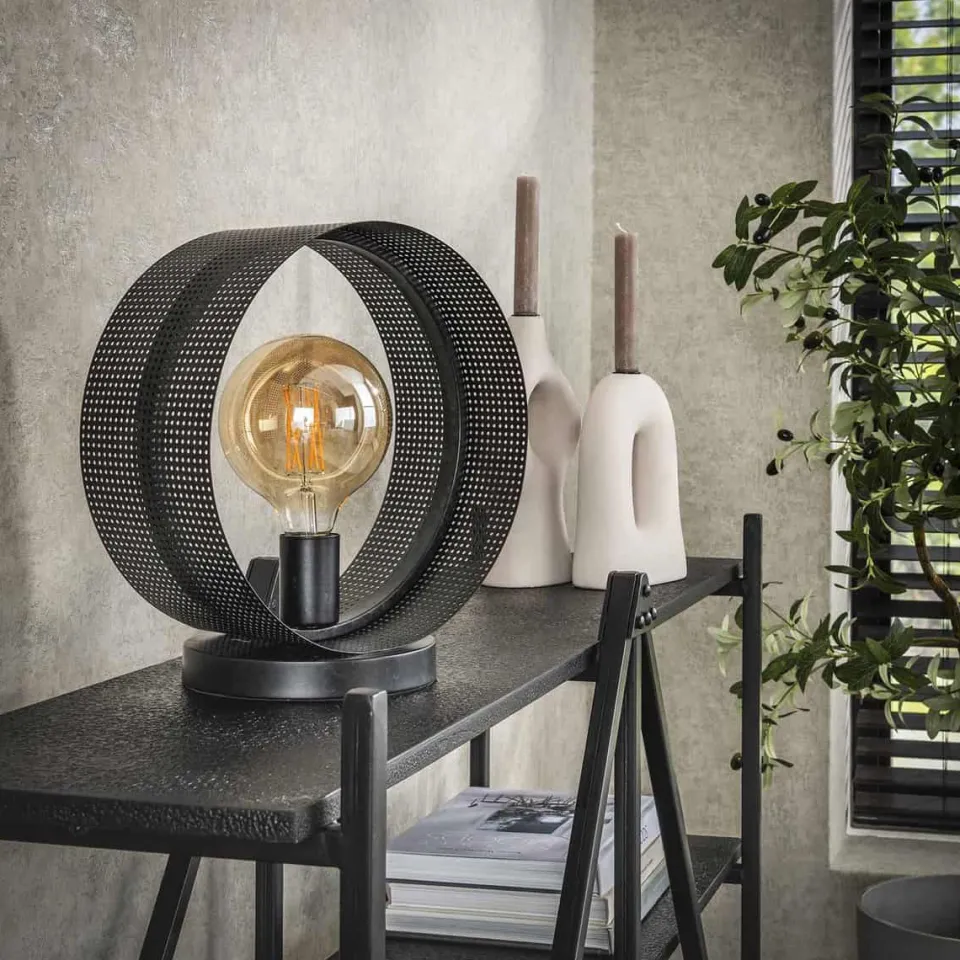 Tafellamp Angelo is afgewerkt in metaal met een charcoal finish. De cirkel is geplaatst op een rond voetje, waardoor deze stabiel staat. De open vorm en de geperforeerde kap zorgen ervoor dat de lichtbron wordt geaccentueerd. Er wordt aanbevolen om LED lichtbron Bol 12,5cm te gebruiken. Deze tafellamp heeft twee bijpassende vloerlampen en een hanglamp.