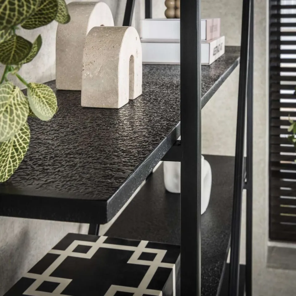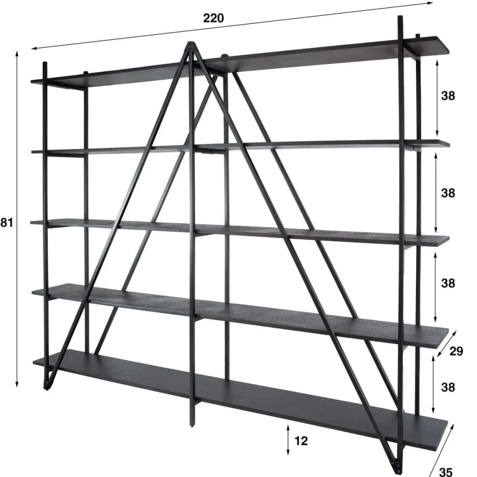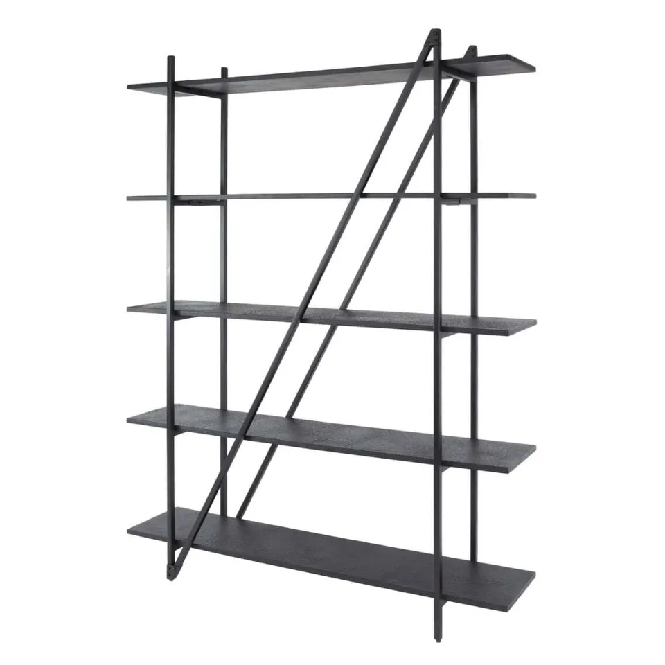 Wandrek Pedro is gemaakt van MDF planken met een donker grijze liquid metal finish en een donker grijs metalen frame. Het rek heeft vijf ruime schappen voor boeken, decoraties of andere items. Omdat het meubel gedemonteerd geleverd wordt, kan het verzonden worden in een compact pakket.