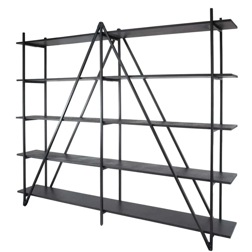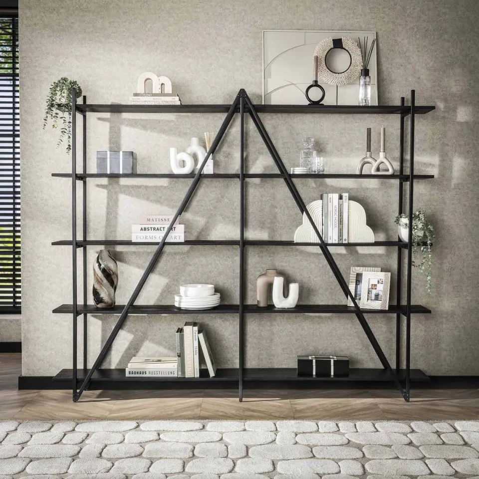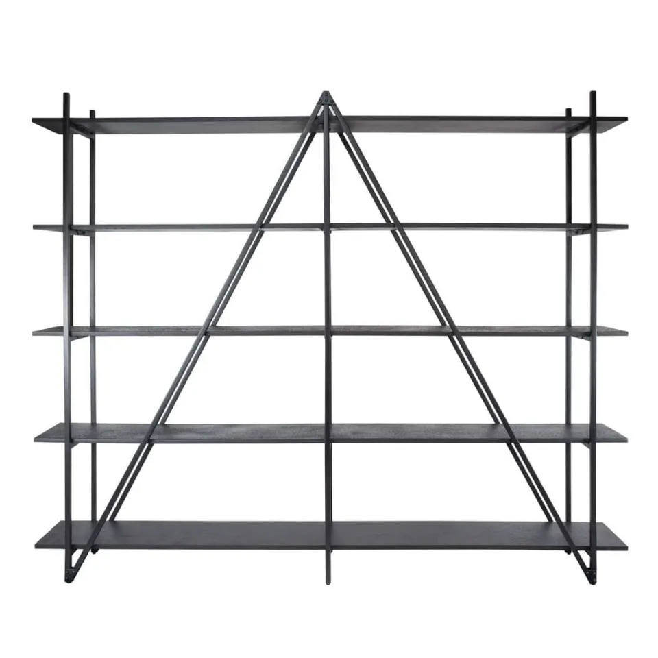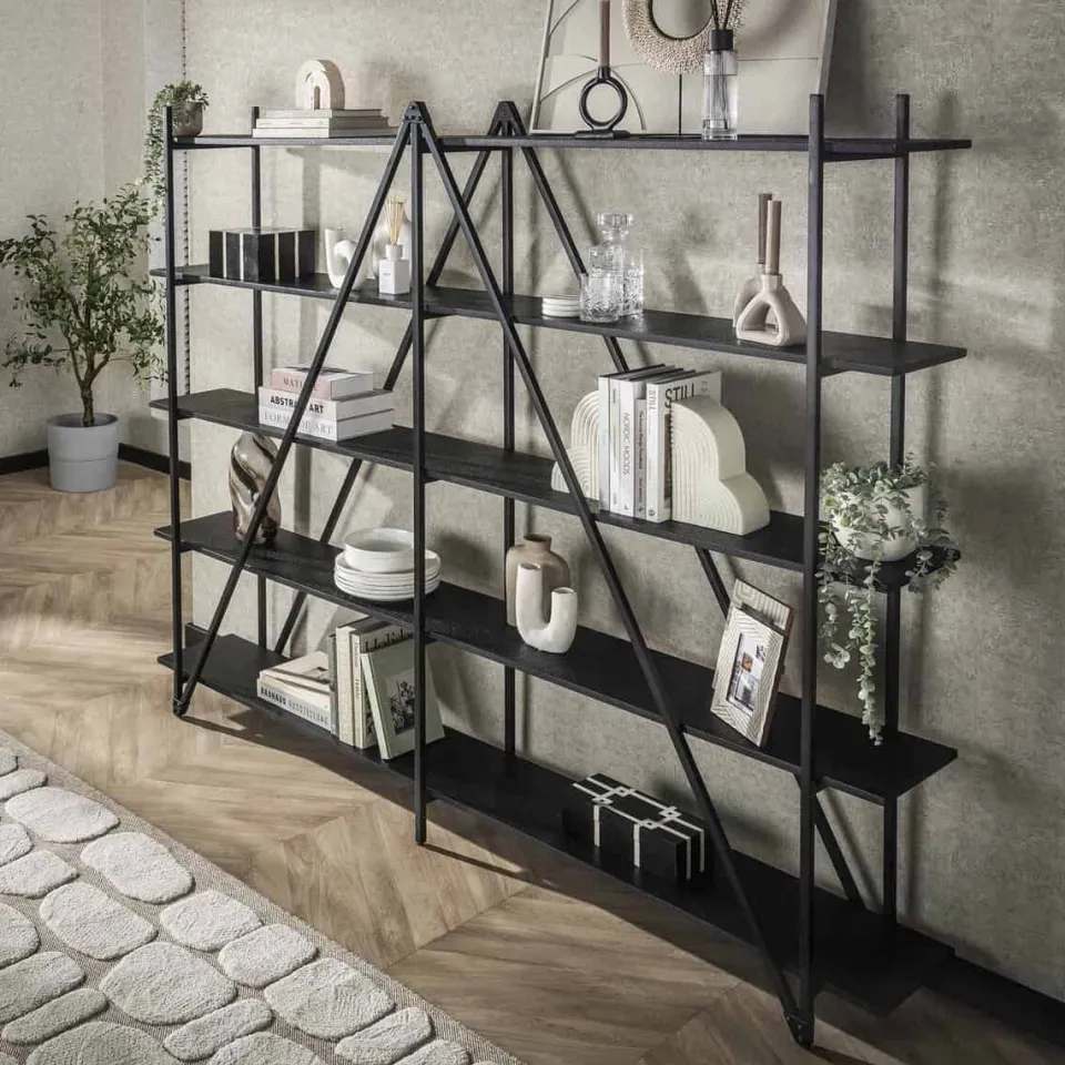 Wandrek Pedro is gemaakt van MDF planken met een donker grijze liquid metal finish en een donker grijs metalen frame. Het rek heeft vijf ruime schappen voor boeken, decoraties of andere items. Omdat het meubel gedemonteerd geleverd wordt, kan het verzonden worden in een compact pakket.
