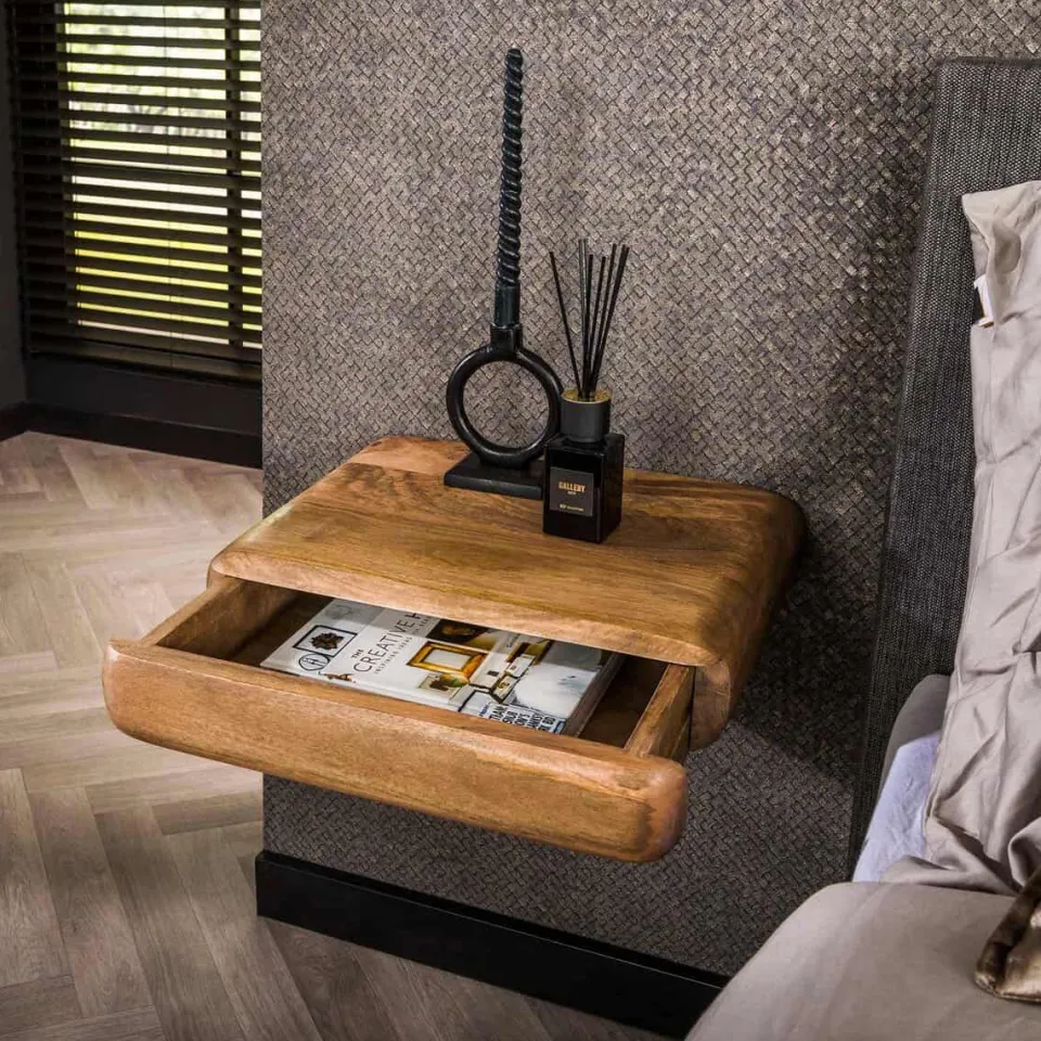Het hangende nachtkastje Gwenda is gemaakt van duurzaam mango hout en heeft een eigentijds design met prachtige ronde afwerkingen. Het nachtkastje wordt bevestigd aan de muur met een strip met drie schroefgaten, waardoor het zweeft en ruimte bespaart.