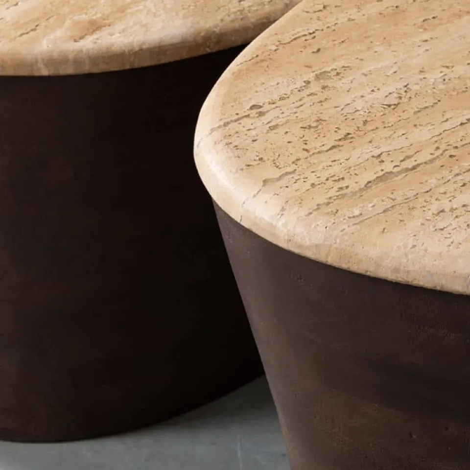 De Ravi-collectie bestaat uit twee afzonderlijke salontafels in verschillende maten, met een organische driehoekige vorm, wat een speelse uitstraling geeft. Deze veelzijdigheid biedt je de vrijheid om de tafels naar eigen smaak te stylen, waardoor ze samen een dynamisch geheel vormen. Uiteraard zijn ze afzonderlijk ook echte eyecatchers.