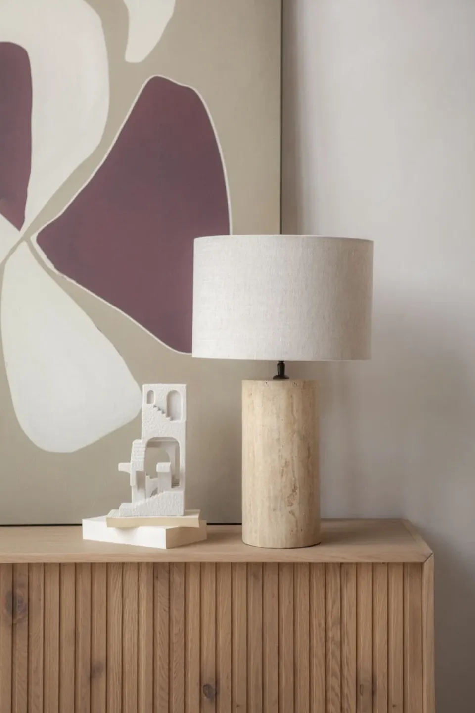 De By-Boo Tafellamp Amara combineert elegantie en natuurlijke materialen in een tijdloos design. Met een voet van travertin en een lampenkap van linnen straalt deze lamp een serene en luxe sfeer uit. Verkrijgbaar in een grote en kleine variant, past de Amara perfect in elke interieurstijl, van modern tot Japandi.