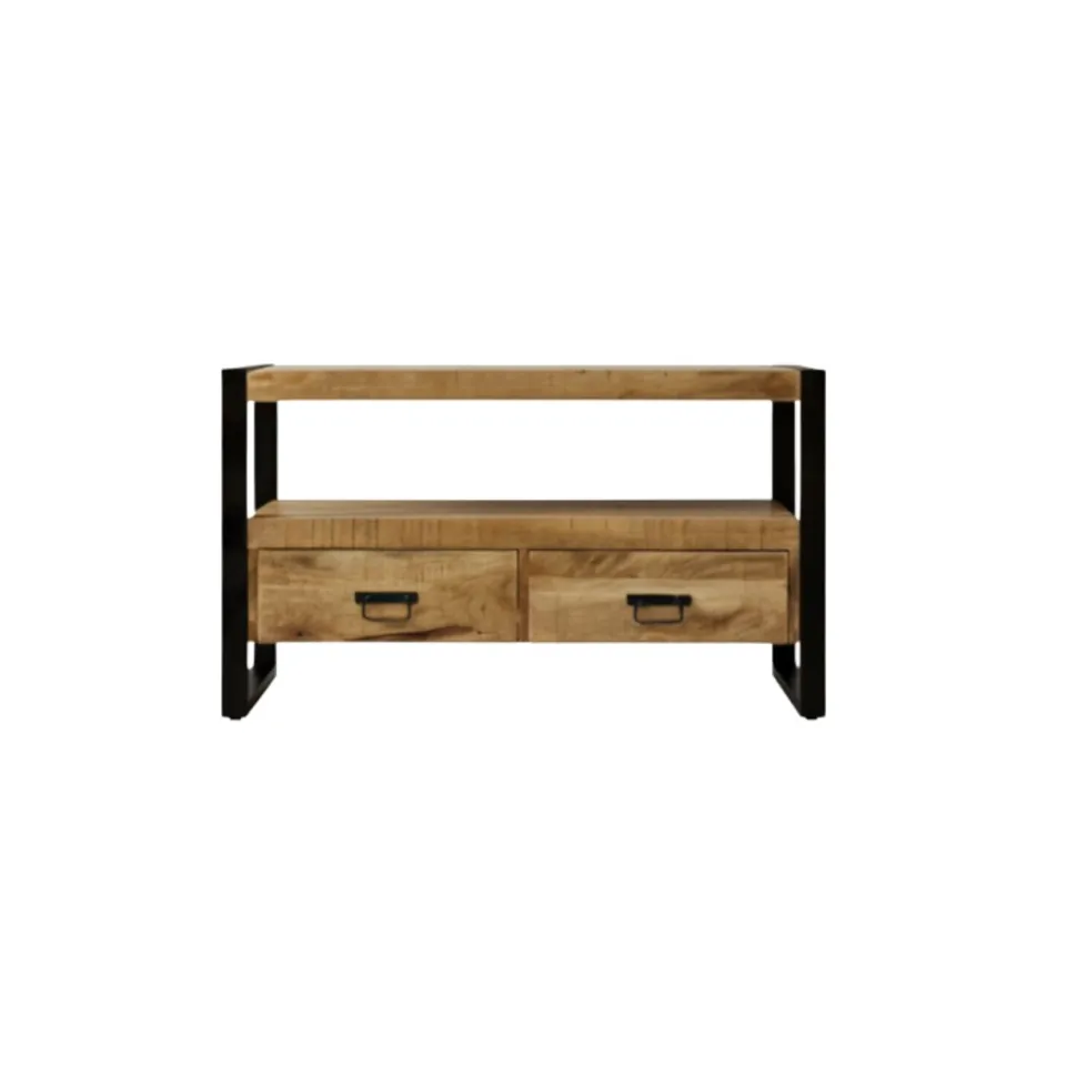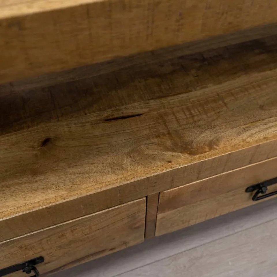 TV-meubel Britt is een meubel met een industriële uitstraling, gemaakt van mangohout in combinatie met robuust zwart metaal. Verkrijgbaar in drie formaten: met 2, 3 of 4 lades biedt Britt volop opbergruimte voor je apparatuur, afstandsbedieningen en andere woonaccessoires. Dankzij het tijdloze ontwerp past dit tv-meubel moeiteloos in moderne, industriële en zelfs landelijke interieurs. De lades zijn ruim en praktisch ingedeeld, waardoor je jouw woonkamer eenvoudig netjes en georganiseerd houdt. Britt is onderdeel van de meubelserie Britt, waardoor je het perfect kunt combineren met andere meubels voor een consistent geheel.