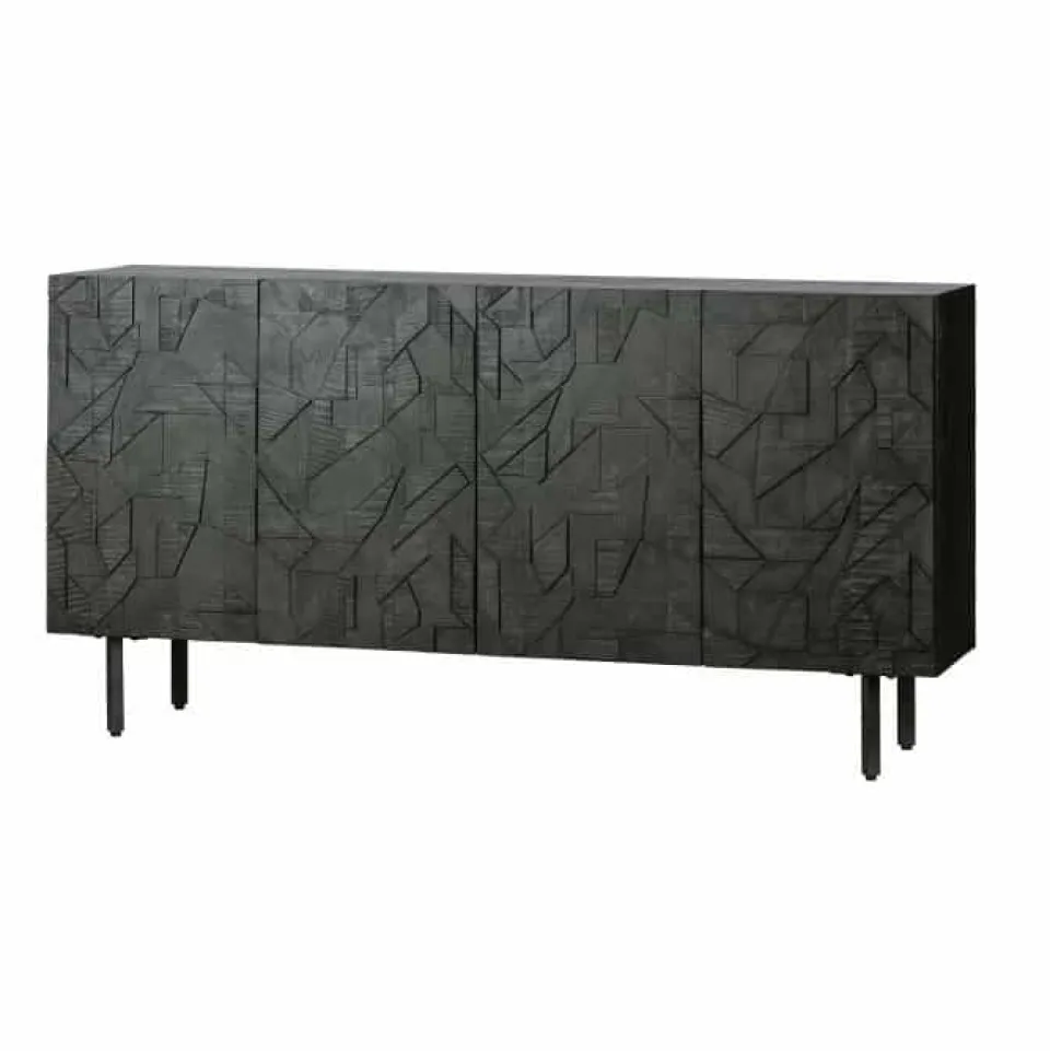 Het dressoir heeft een totale hoogte van 83 cm, is 160 cm breed en 40 cm diep. De metalen poten hebben een hoogte van 18 cm. Het metalen frame is 2×2 cm dik. De vier deuren met houtsnijwerk zijn 65 cm hoog, 39,5 cm breed en 2 cm dik. De deurtjes beschikken over een softclose systeem. De inhoud van de kast is in twee grote vakken verdeeld met elk een 78 cm brede legplank. Deze legplank heeft een diepte van 33,5 cm, aan de achterzijde is een kier van 1,5 cm dus kleine items kunnen op de onderste plank belanden. De open vakken hebben in een inhoud van (hxbxd) 30x78x35 cm.