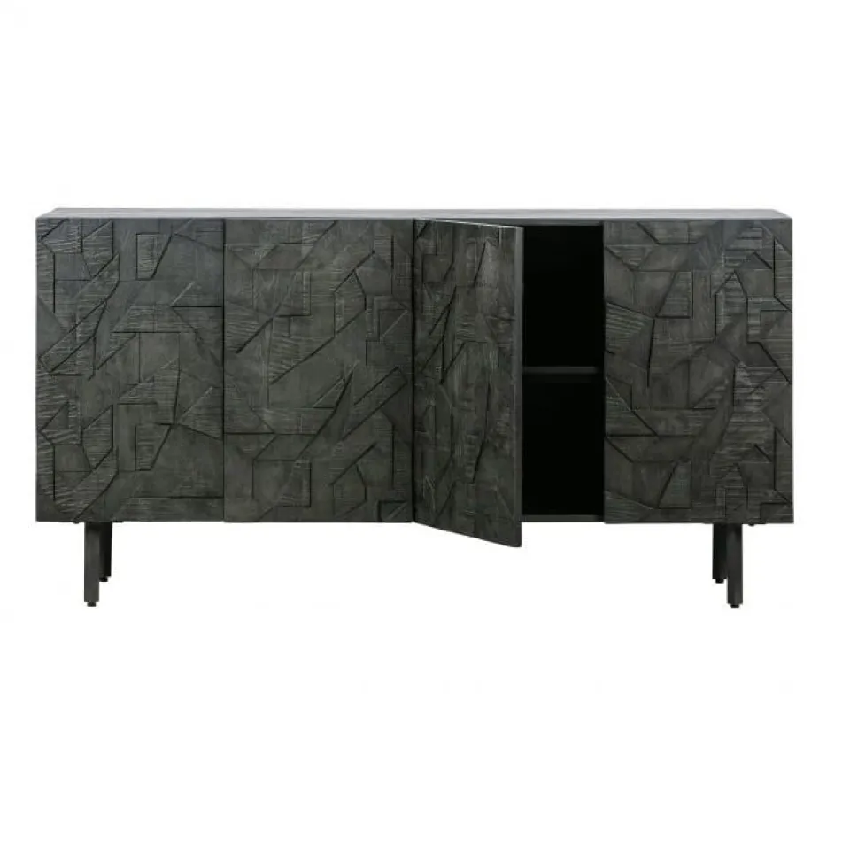 Met het Counter dressoir plaats je een echte eyecatcher in huis! Het opvallende houtsnijwerk op de deuren trekt de aandacht en blijft boeien. Elk dressoir heeft zijn eigen houtstructuur in het snijwerk, wat elk item uniek maakt. Het Counter dressoir is vervaardigd uit robuust mangohout. Achter de vier deuren schuilt een zee van opbergruimte. Deze ruimte is opgedeeld door twee horizontale planken, deze planken kunnen verwijderd worden maar is niet verstelbaar.