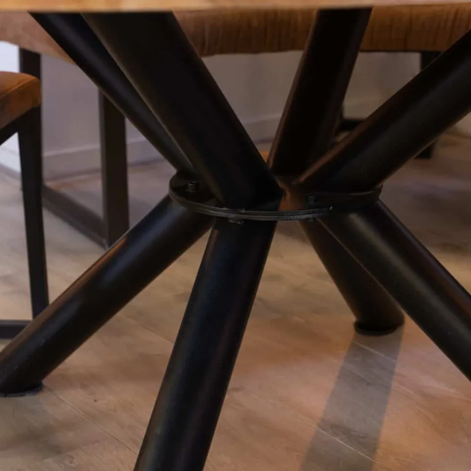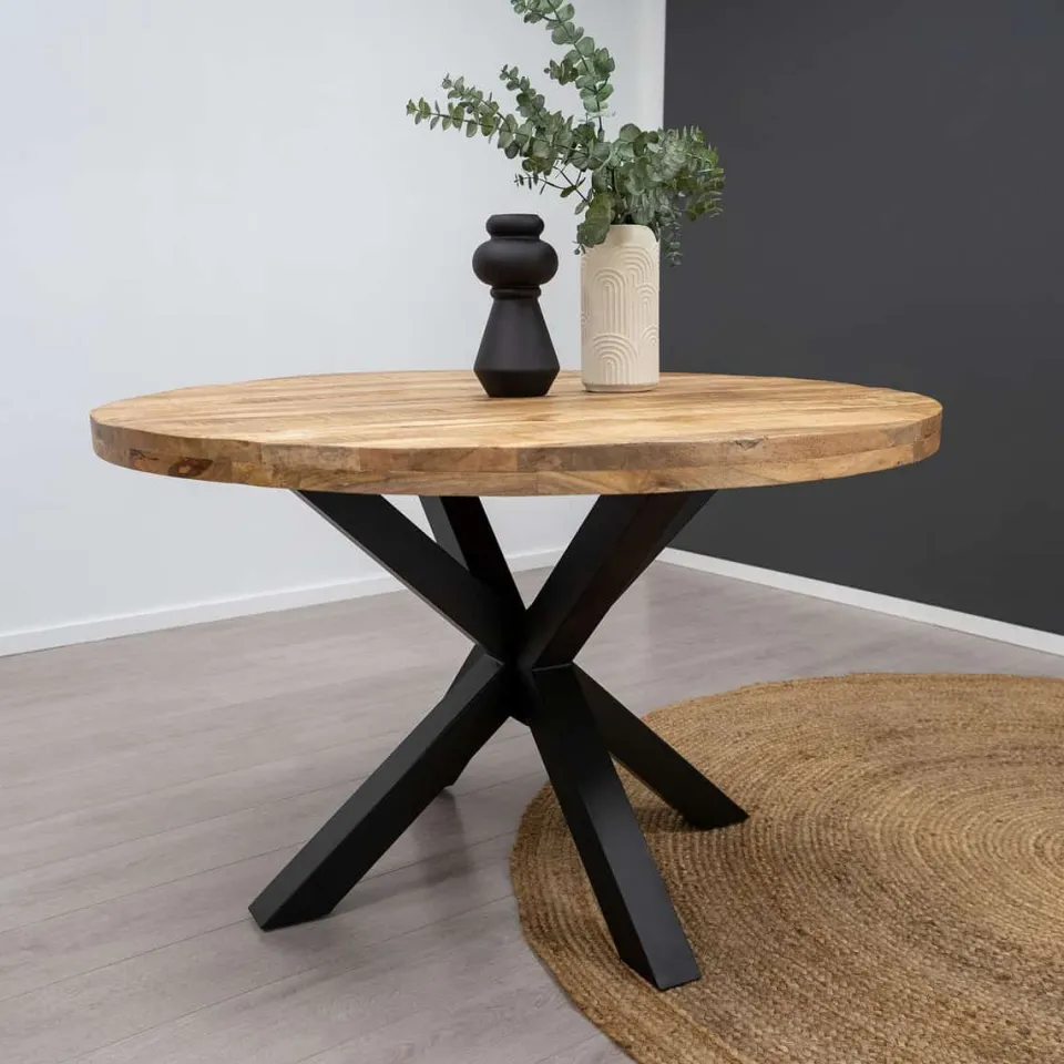 Ronde Eettafel Monique van mangohout en metaal HUUS collectie is een elegante en robuuste keuze voor jouw eetkamer. Het 6 cm dikke mangohouten tafelblad heeft unieke houtnerven en warme tinten die elke tafel tot een karaktervol pronkstuk maken. Het strakke, zwarte metalen spinpoot-frame zorgt voor zowel stabiliteit als een stoere industriële touch — een krachtig contrast dat je interieur meteen karakter geeft.