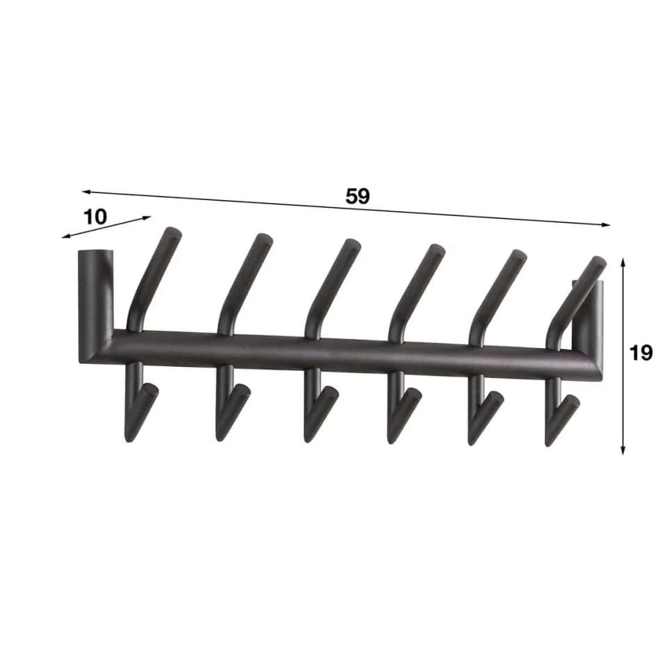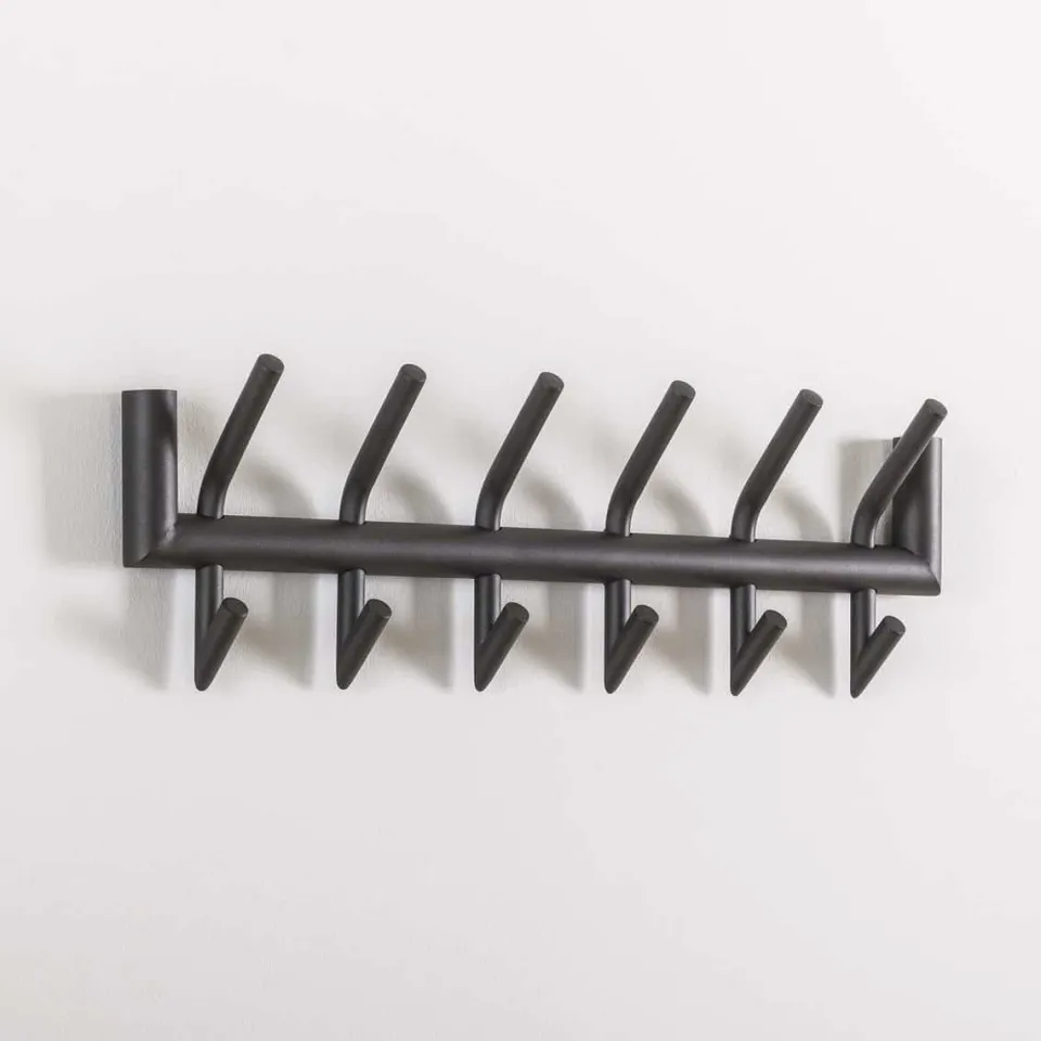 Deze kapstok heeft een ronde buis, uitgevoerd in donkergrijs mat gepoedercoat staal. In totaal heeft dit model 6 gelaste haakjes, die zowel aan de bovenkant als aan de onderkant een ophangmogelijkheid hebben. De stoere kapstok wordt opgebouwd geleverd en kan door middel van twee bevestigingspunten eenvoudig aan de wand worden gemonteerd.