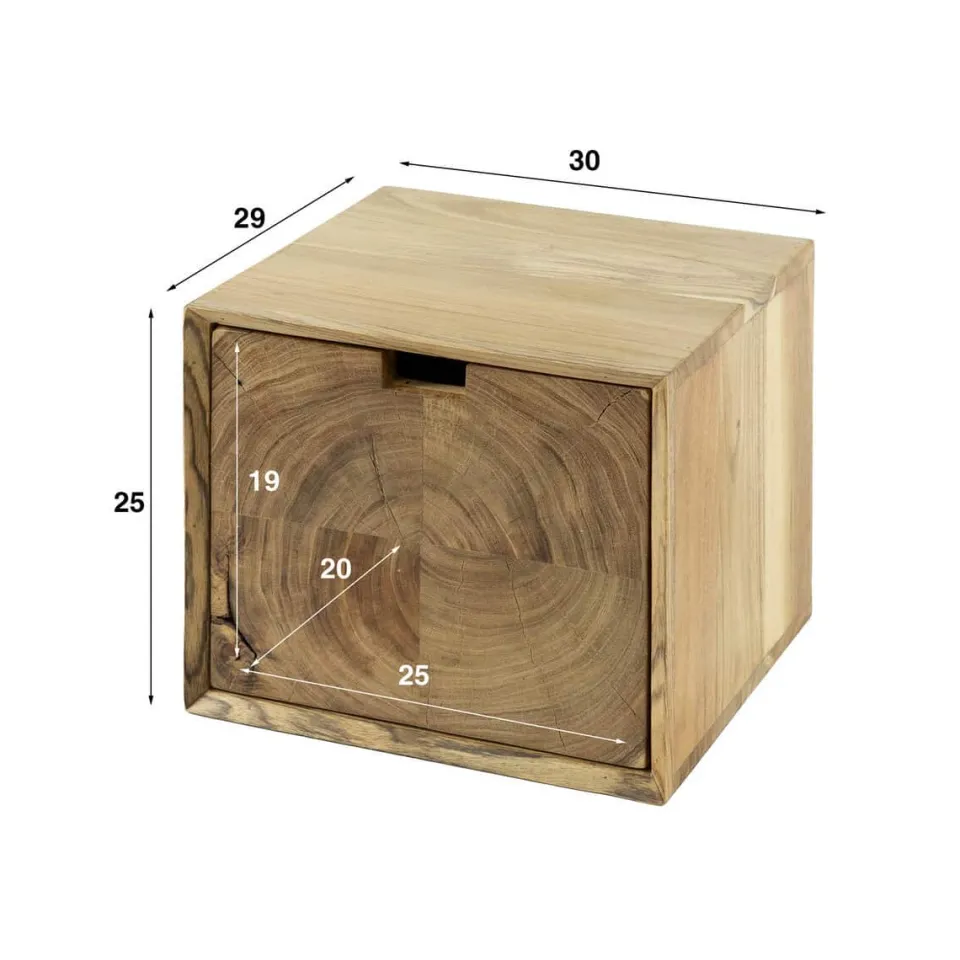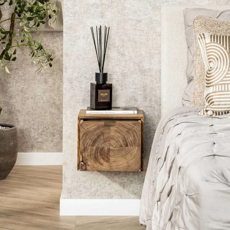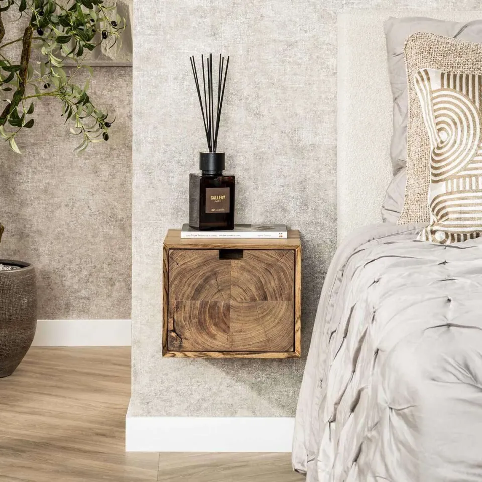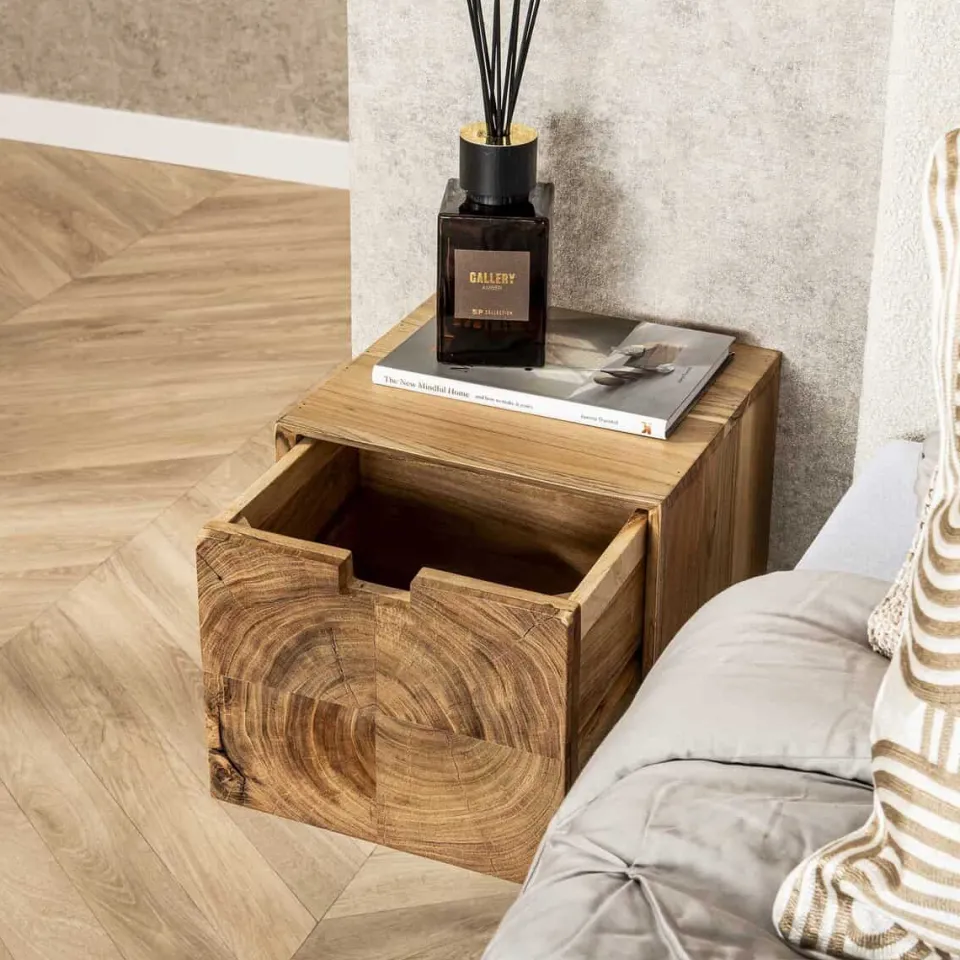 Het zwevende nachtkastje Blok is vervaardigd uit massief acaciahout en afgewerkt met een matte, transparante lak die de natuurlijke houtstructuur mooi benadrukt. Het kastje heeft één lade met een opvallend front in de vorm van een boomdoorsnede. Montage aan de muur is eenvoudig met twee stevige beugels, hierdoor lijkt het te zweven en blijft de vloer vrij.