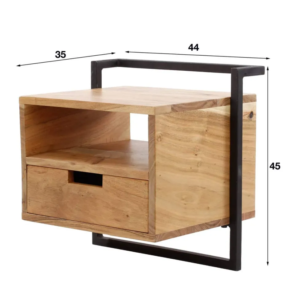 Dit nachtkastje is uitgevoerd in metaal met acaciahout. Deze combinatie geeft dit nachtkastje een eigentijdse uitstraling en deze is dan ook heel goed te combineren met de meeste bedden. Dit nachtkastje wordt door middel van een strip met drie schroefgaten aan de muur gemonteerd, waardoor het nachtkastje hierop kan hangen. Zie hiervoor de foto.