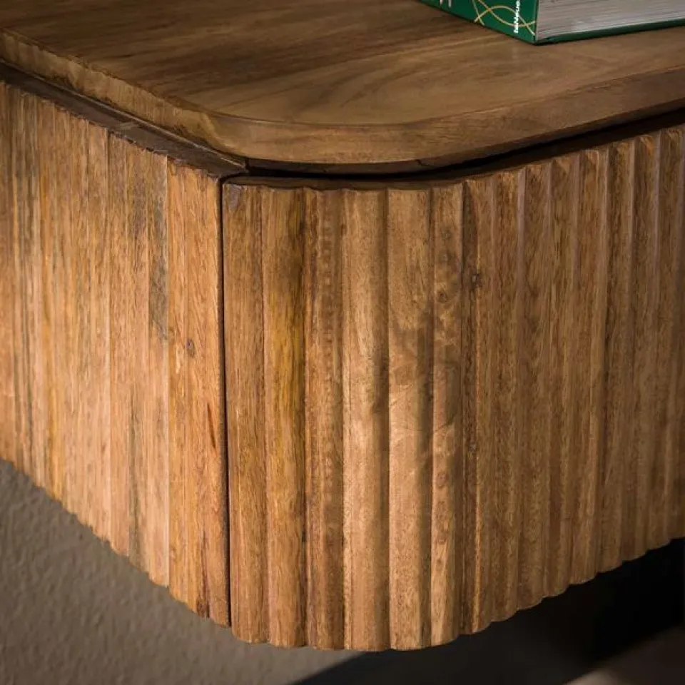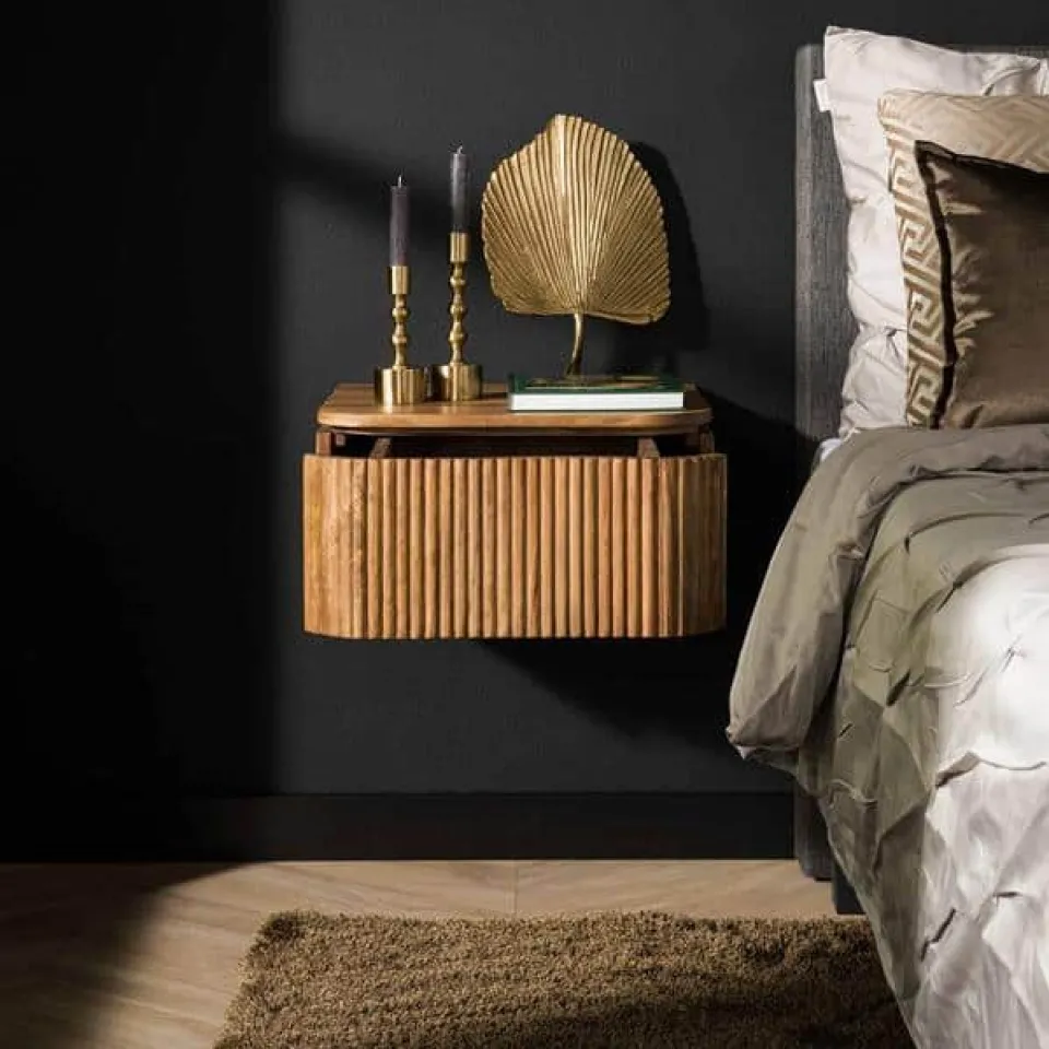 Nachtkastje Lexie is gemaakt van duurzaam mango hout en heeft een eigentijds design met een golfontwerp. Het hangende nachtkastje wordt bevestigd aan de muur met een strip met drie schroefgaten, waardoor het zweeft en ruimte bespaart. Zie hiervoor de foto. Beide nachtkastjes hebben een lade.