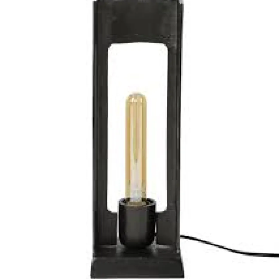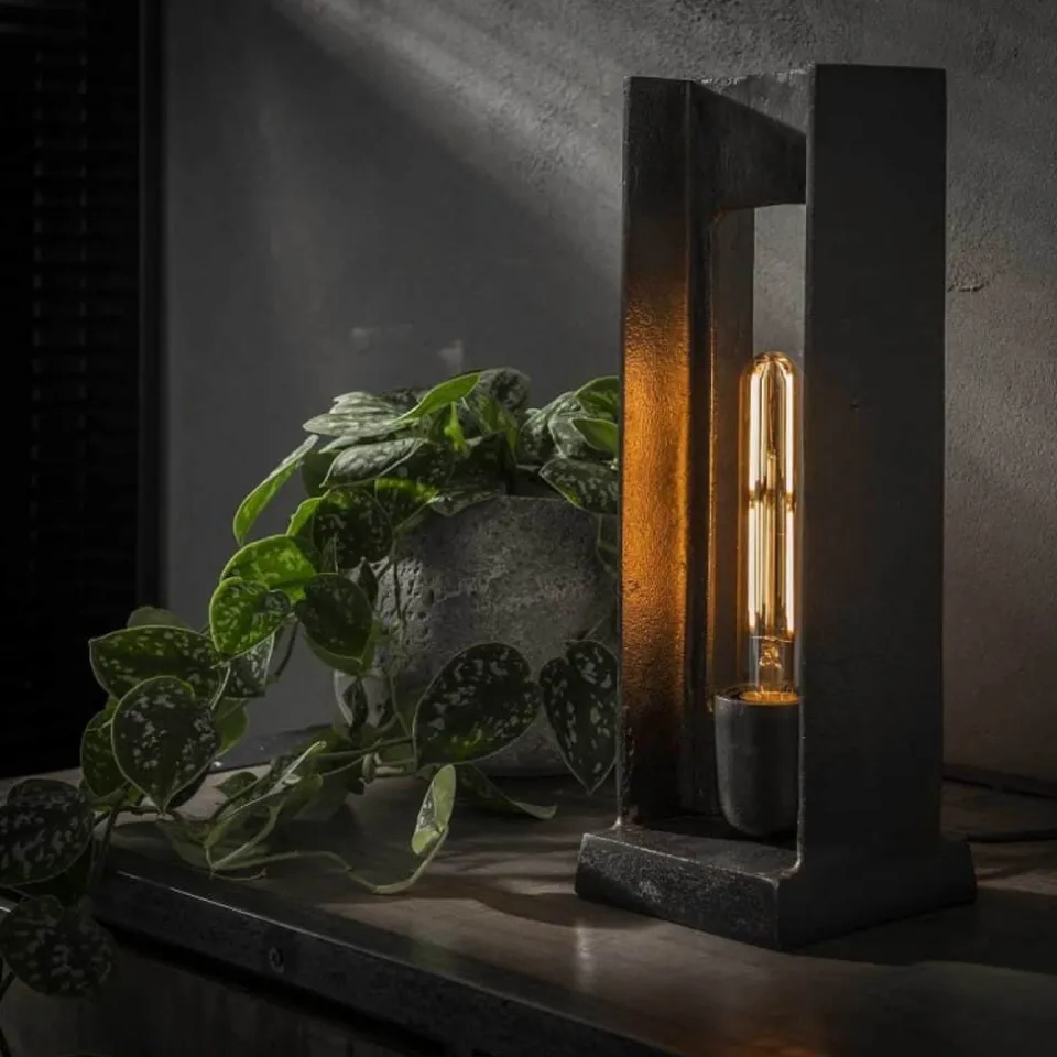 Deze tafellamp heeft een H-figuur met een rechthoekig open vak. De vorm in combinatie met de zwart nikkel afwerking geeft een industriële look. Door het open frame is de lichtbron goed zichtbaar en deze mag gezien worden!