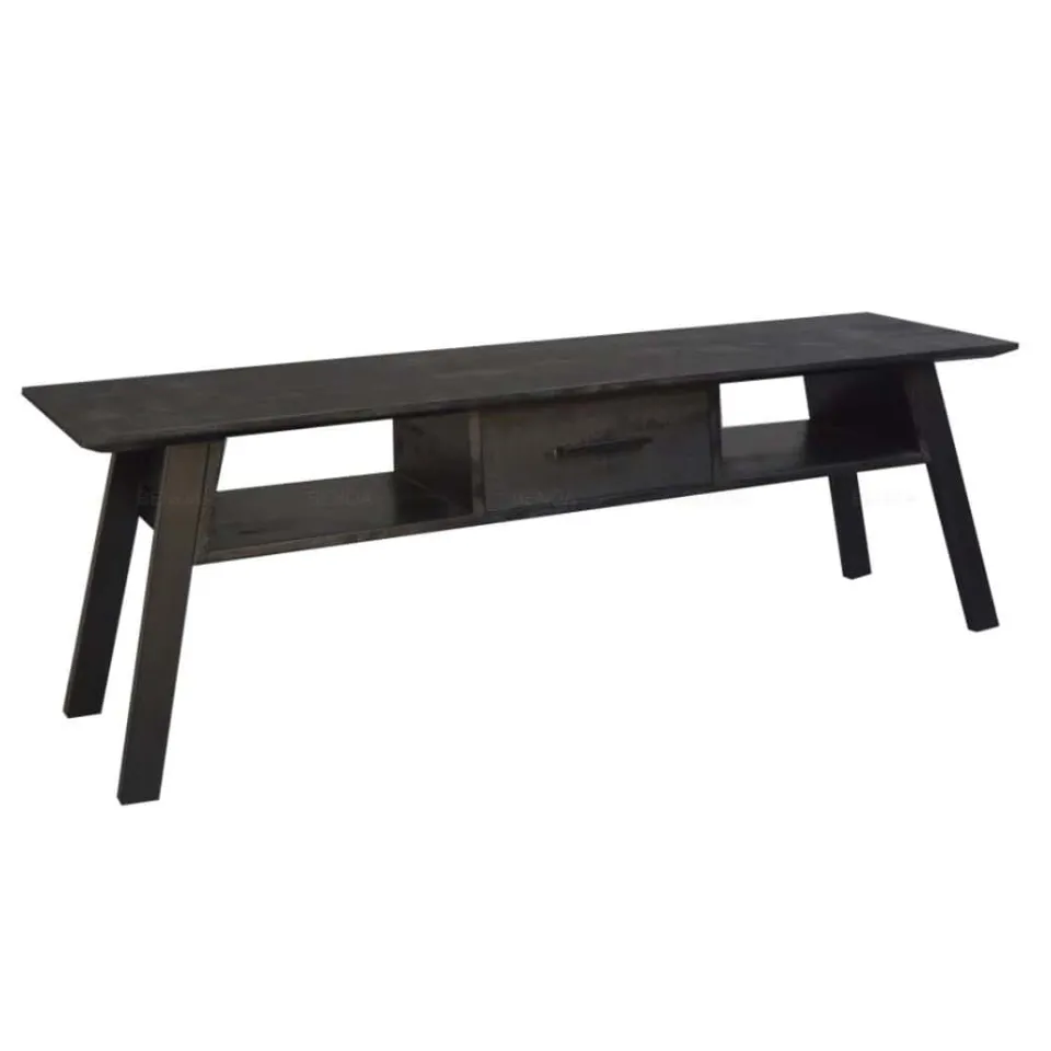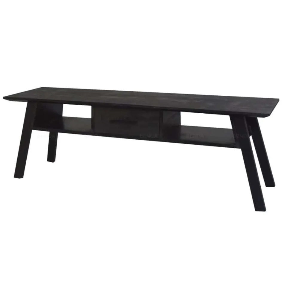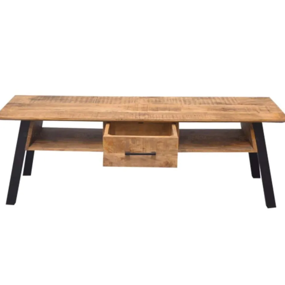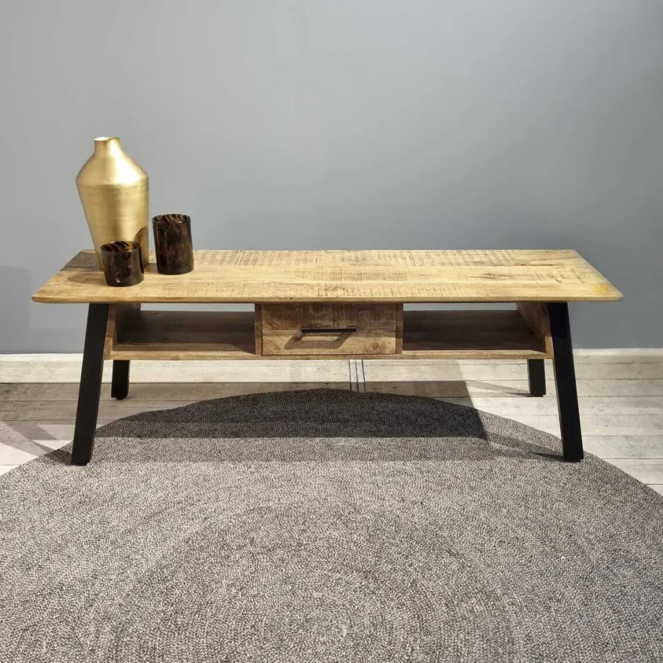 Strak zwart of naturel mangohout met ge-poedercoate zwarte poten.