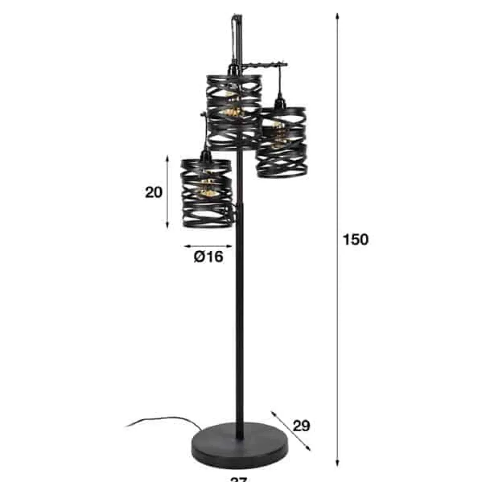 Deze vloerlamp heeft drie spindle kappen en een rechthoekig armatuur. Deze combinatie zorgt voor een speelse eigentijdse lamp. Deze metalen lamp is afgewerkt in slate grey met een touch of brown. Door de openheid van de kappen wordt het licht mooi gedoseerd door de ruimte verdeeld. Er wordt aangeraden om LED lichtbron (8450) te gebruiken. Deze vloerlamp maakt deel uit van een serie bestaande uit een tafellamp, een hanglamp en een vloerlamp.
