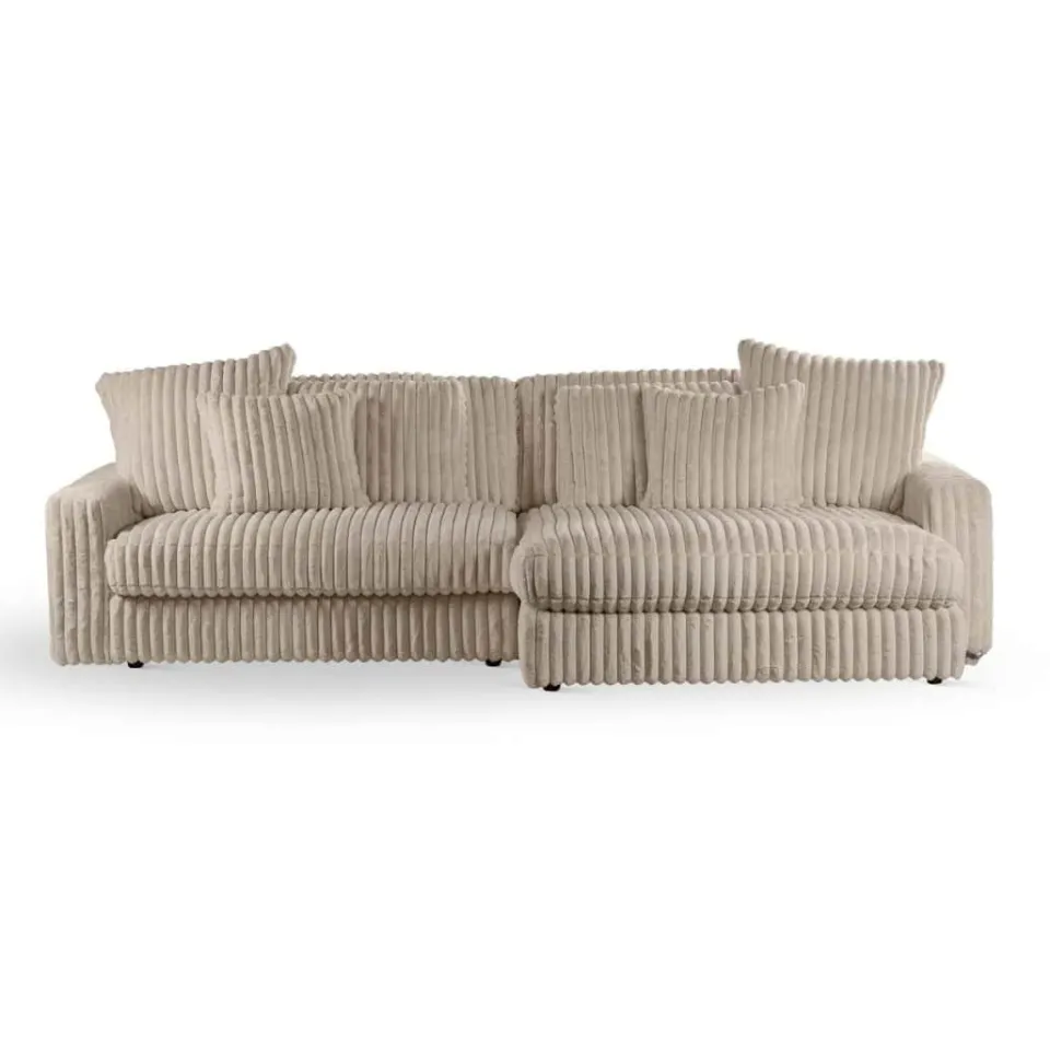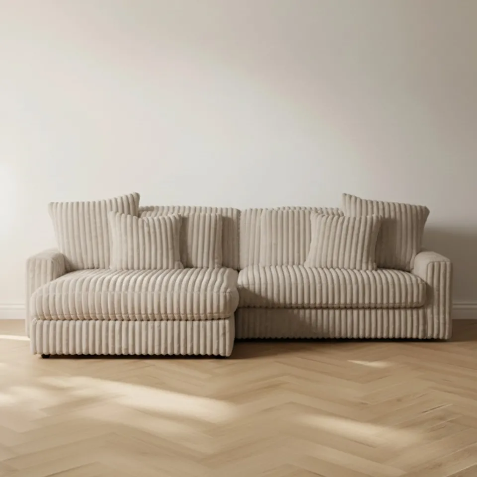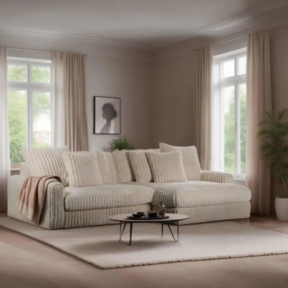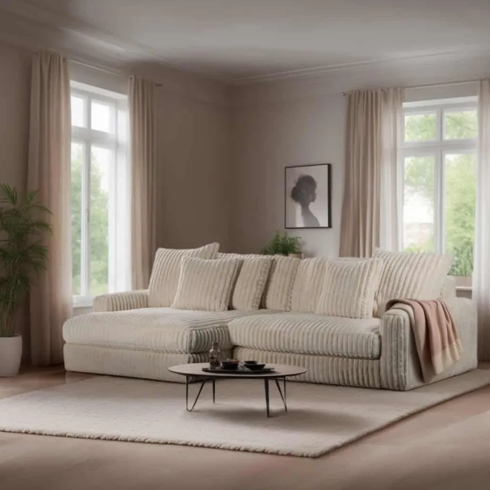 De bank is bekleed met een hoogwaardige stof in een stijlvolle beige tint. Deze kleur vormt een rustige basis in de woonkamer en laat zich eenvoudig combineren met andere meubels en accessoires. De royale afmetingen bieden voldoende ruimte om samen te zitten of heerlijk te ontspannen. Daarnaast zorgen de comfortabele zitdiepte en prettige rughoogte voor goede ondersteuning, ook tijdens langere momenten op de bank.