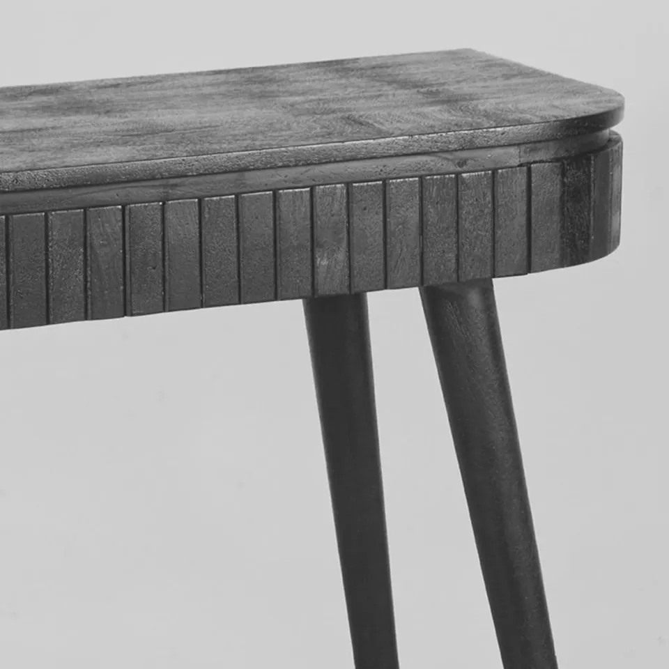 Bureau Nils, uitgevoerd in zwart mangohout, bestaat uit een blad met afgeronde hoeken. Het bureau beschikt over twee ruime lades, waar je gemakkelijk losse spullen in op kunt bergen. De ronde en schuin aflopende poten geven het bureau een luchtige touch en zorgen dat het bureau gaat leven.