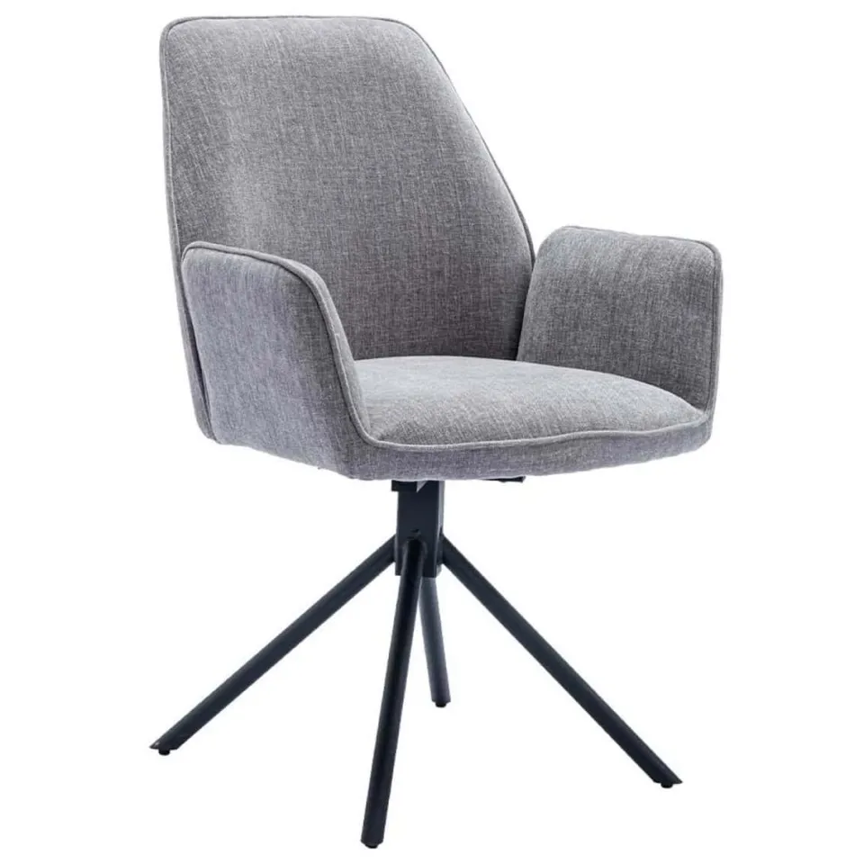 Eetkamerstoel Amaro is een stijlvolle draaistoel die modern design en comfort moeiteloos combineert. De zitting is bekleed met een zachte stof en verkrijgbaar in drie eigentijdse kleuren: koper, grijs en beige. De ergonomisch gevormde kuip met geïntegreerde armleuningen biedt een aangename ondersteuning, ideaal voor lange avonden aan tafel of als comfortabele werkstoel. Het zwarte metalen onderstel met slanke poten is voorzien van een 180 graden draaifunctie, wat zorgt voor extra gebruiksgemak en flexibiliteit.