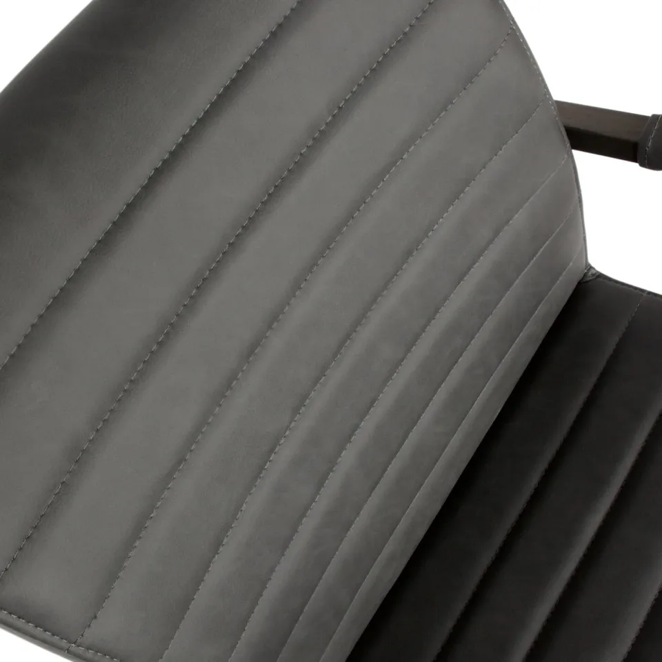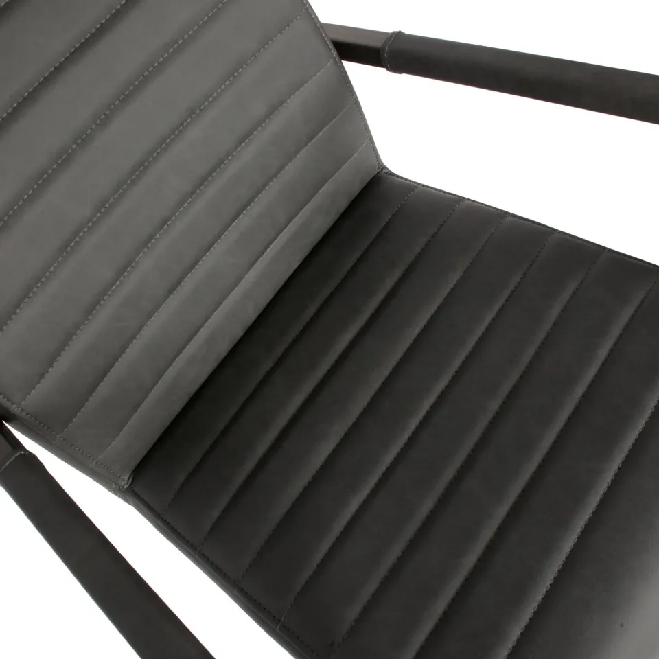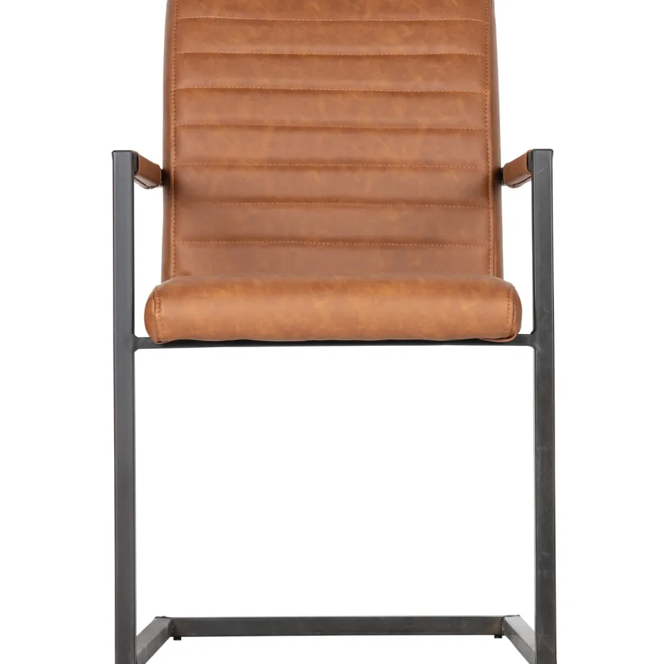 Eetkamerstoel Bas is een stoere en comfortabele toevoeging aan je eethoek. De zitting is bekleed met sterke, onderhoudsvriendelijke stof en heeft een robuuste uitstraling dankzij de brede rugleuning en rechte vormen. De decoratieve stiknaden op de rug geven de stoel extra karakter, terwijl het zwart metalen sledeframe zorgt voor een industriële touch en lichte vering tijdens het zitten. Bas is verkrijgbaar in drie kleuren: antraciet, cognac en zwart — stuk voor stuk perfect passend binnen een krachtig en modern interieur.