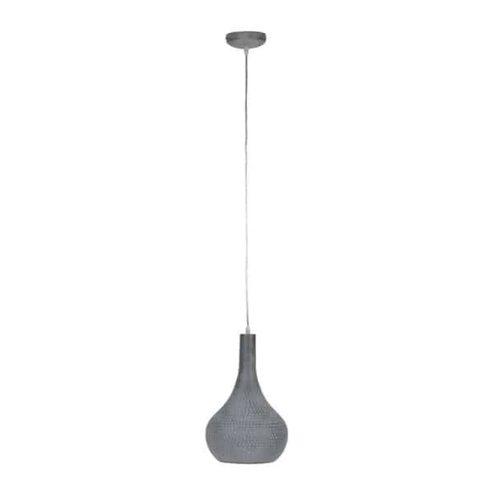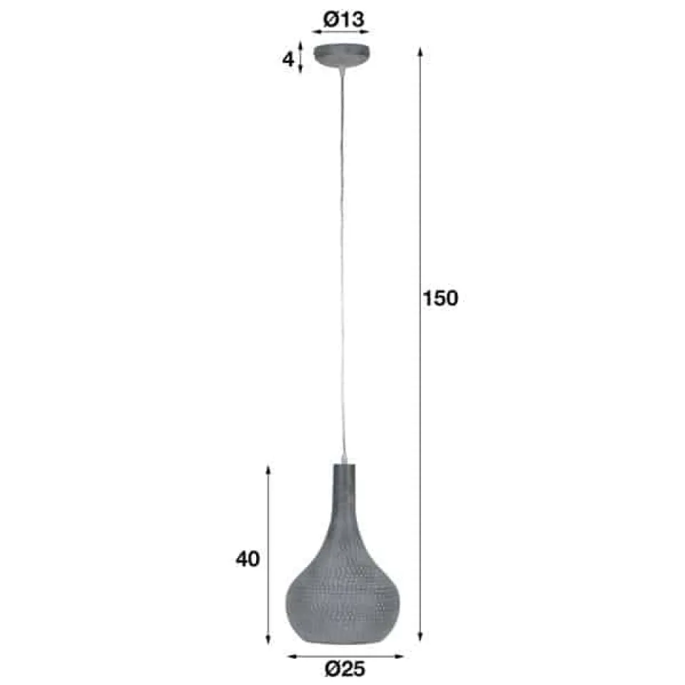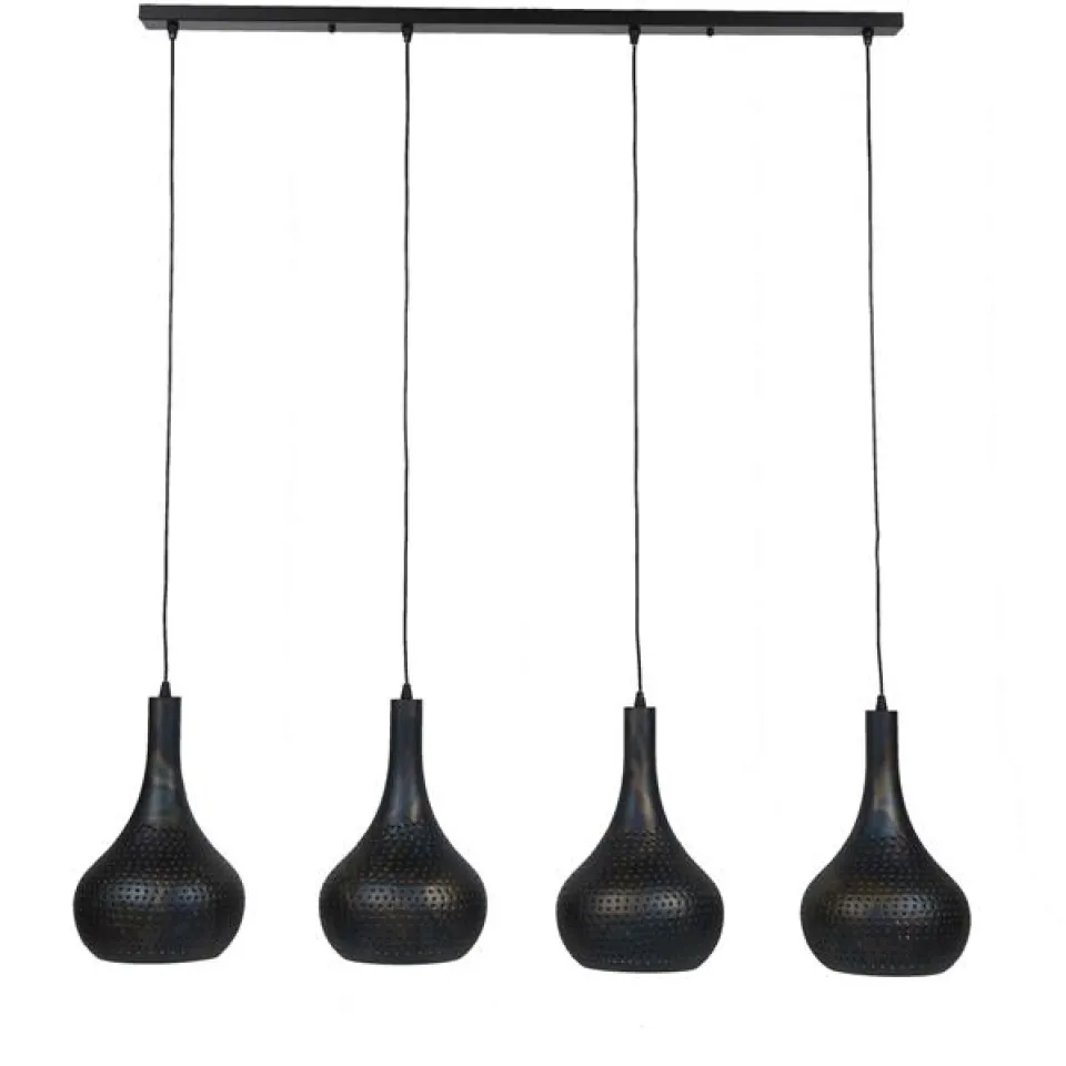 Deze 4-lichts hanglamp, inclusief de plafondbevestiging, is uitgevoerd in grijs of zwart/bruin metaal. De kegelvormige lampenkappen zijn volledig handmatig geperforeerd, waardoor elke lamp uniek is. De gaatjes maken het model semi-transparant, waardoor het licht sfeervol wordt doorgelaten. De lamp is verder voorzien met kabels van textiel. Gezien de afmeting van deze lamp, past hij perfect boven een middelgrote eetkamertafel.