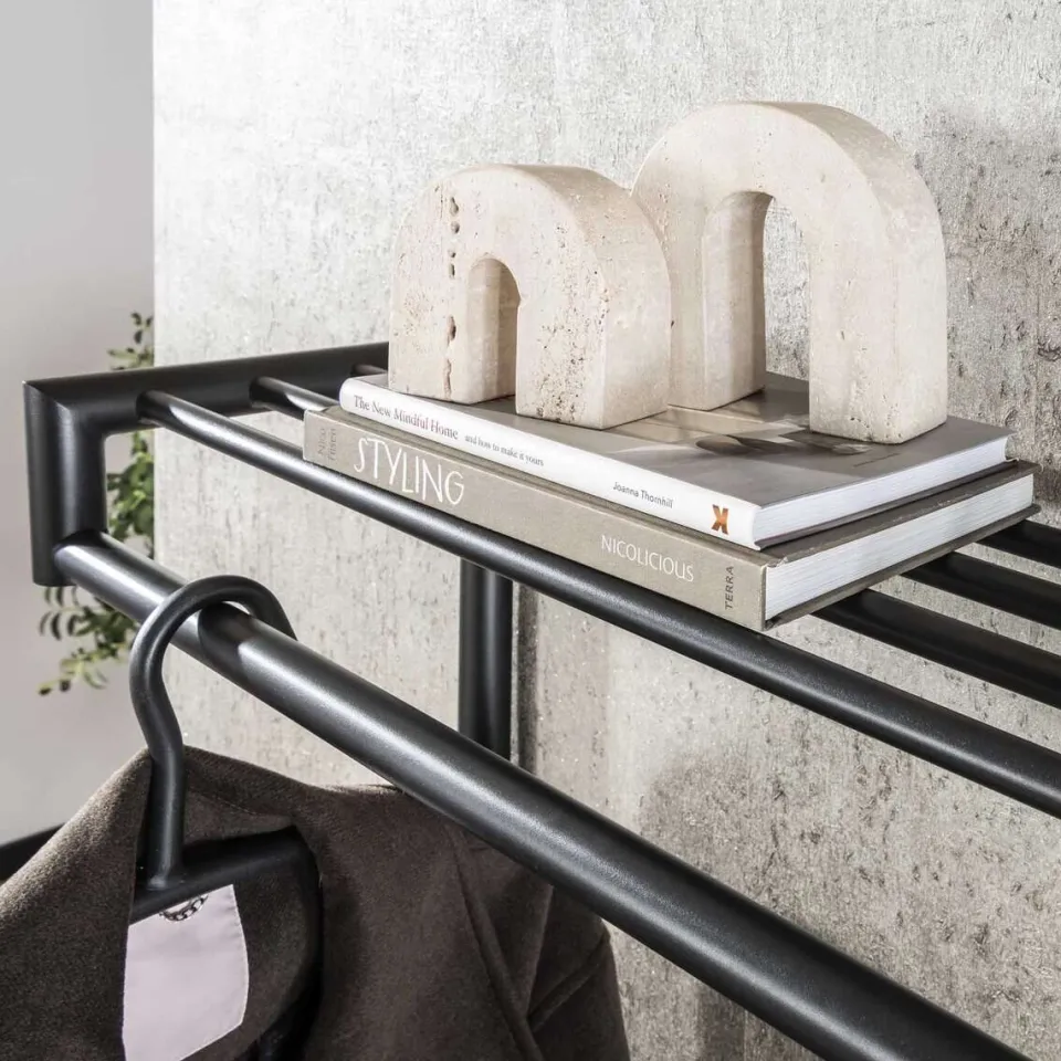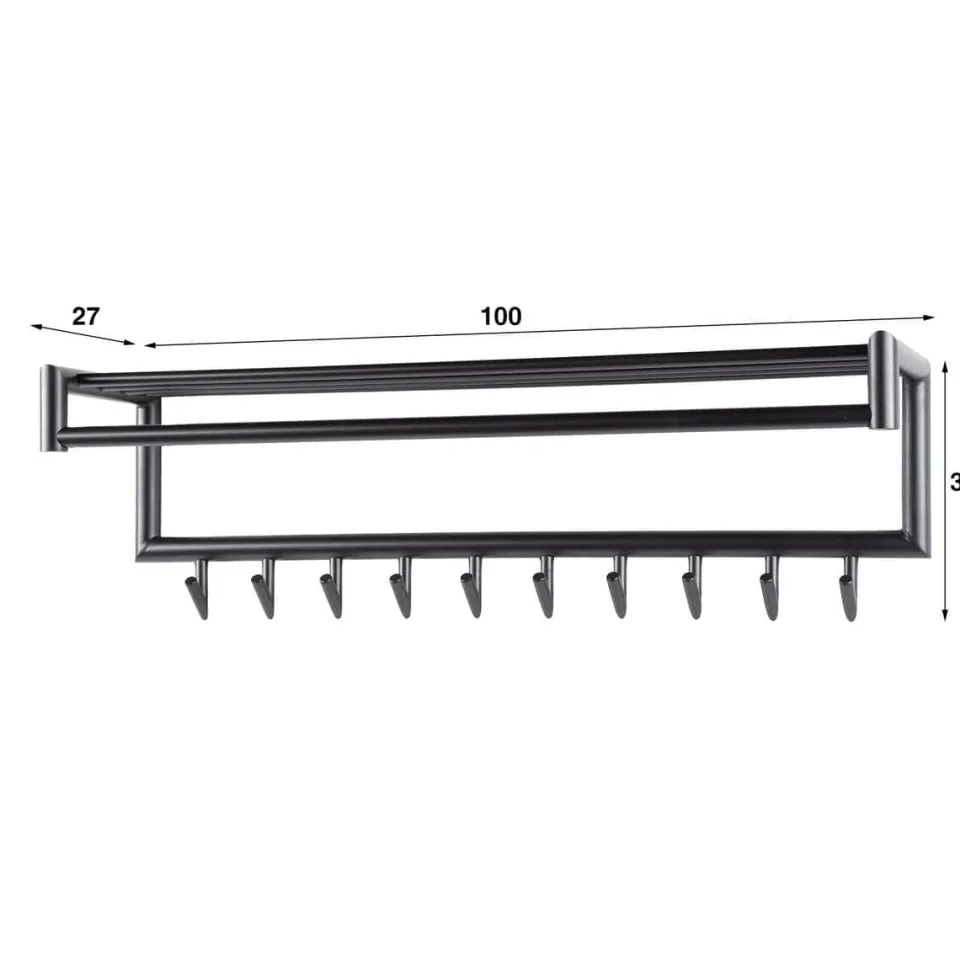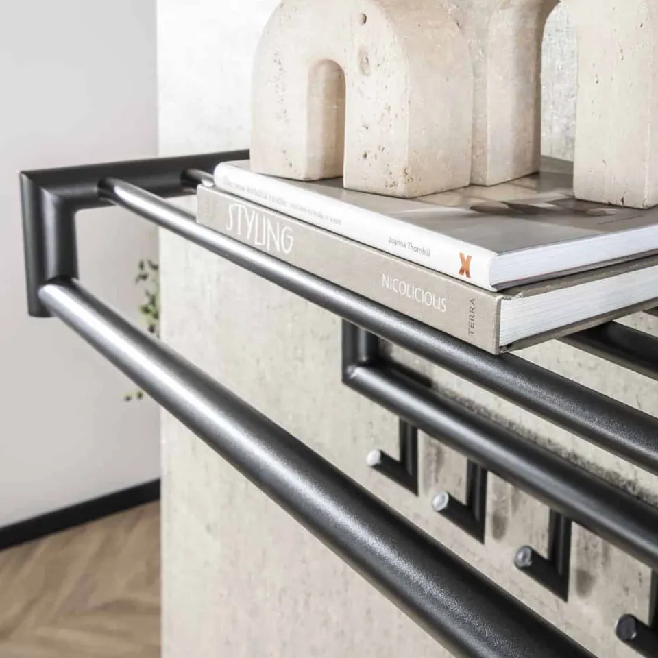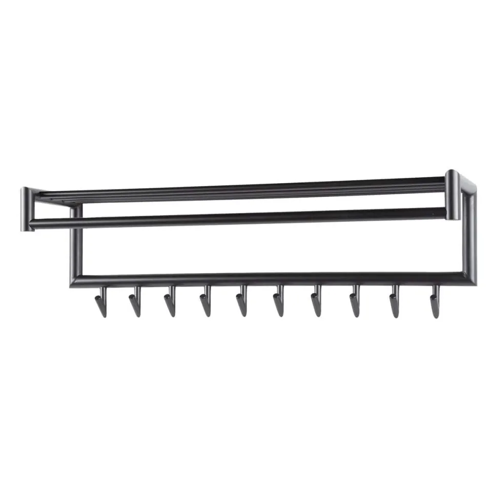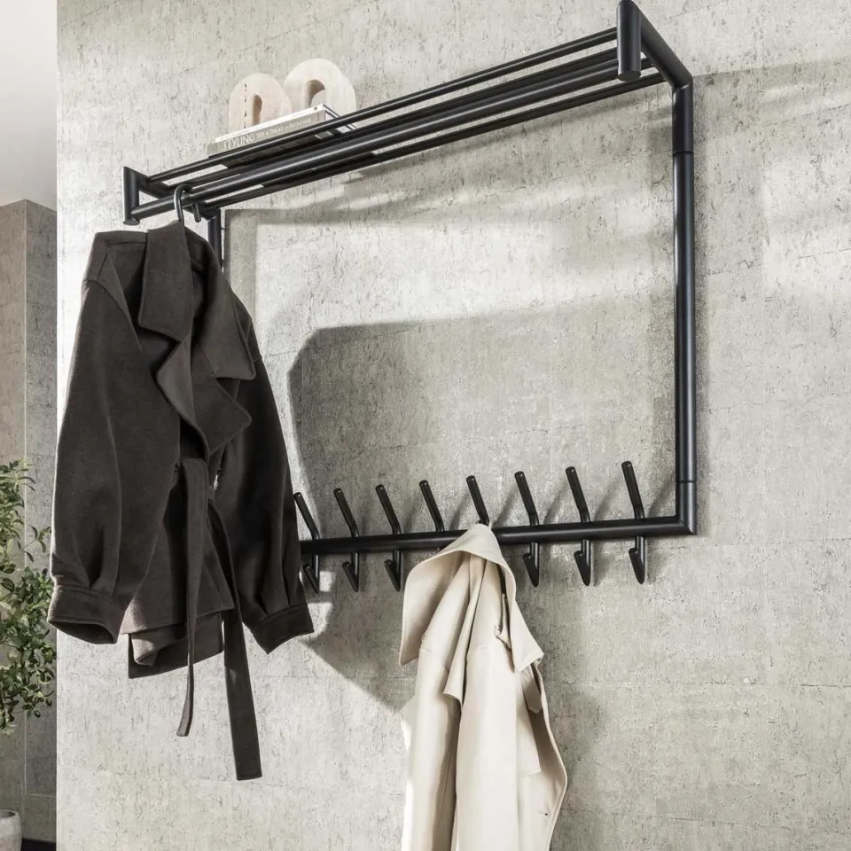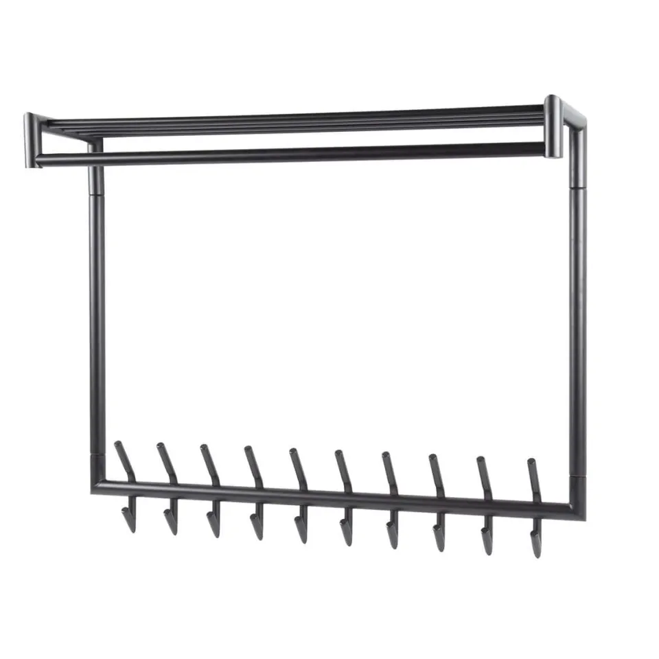 Deze kapstok heeft een ronde buis, uitgevoerd in donkergrijs mat gepoedercoat staal. De hoedenplank bestaat uit meerdere van deze ronde buizen en in totaal heeft dit model 10 of 20 gelaste haakjes. Deze kapstok kan door middel van twee bevestigingspunten eenvoudig aan de wand worden gemonteerd.