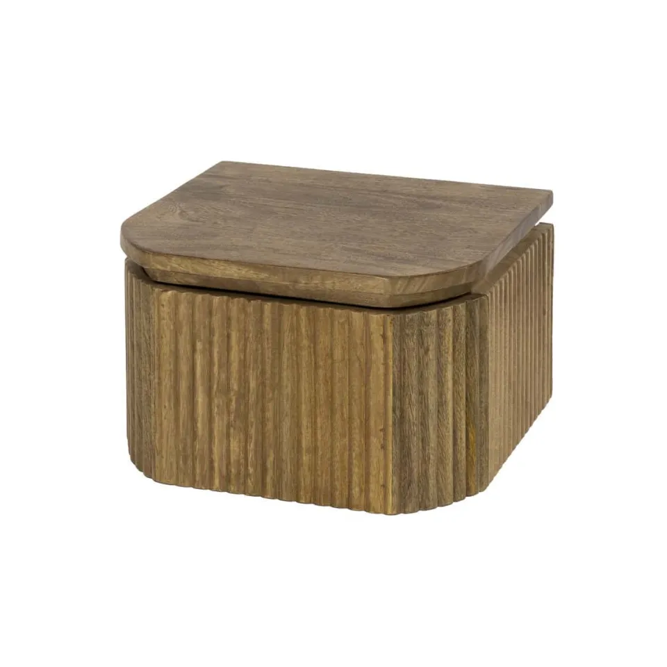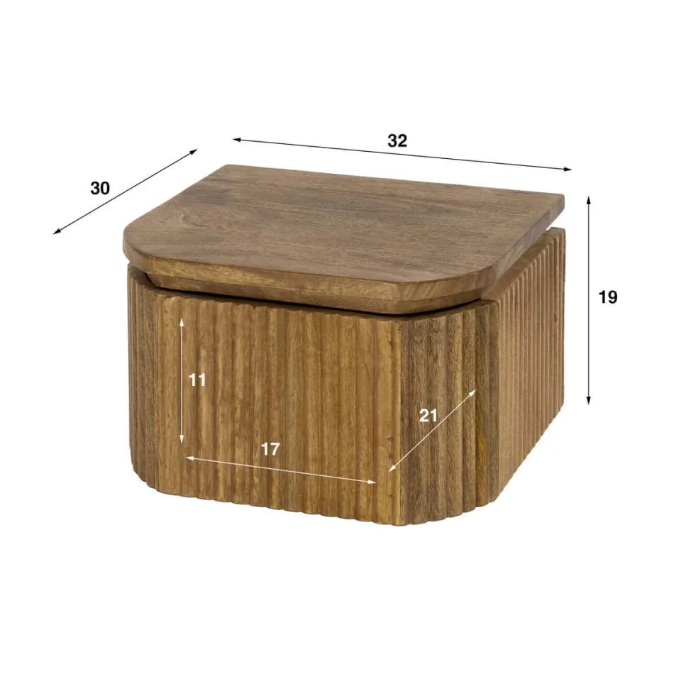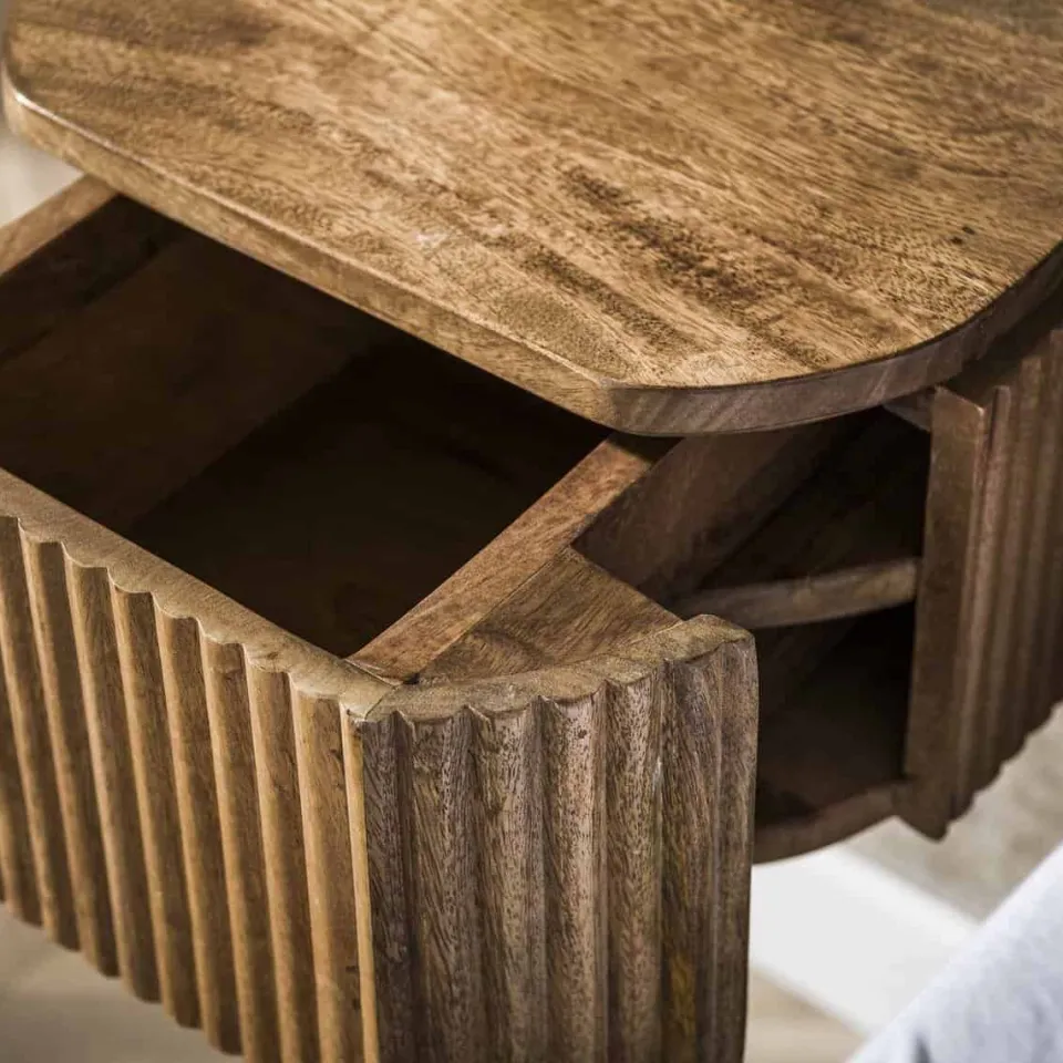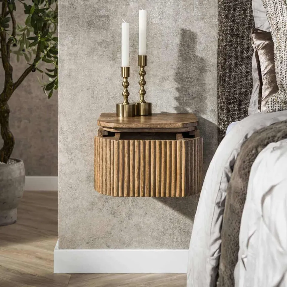 Nachtkastje Femke is gemaakt van massief mangohout met een zandkleurige afwerking. De voor- en zijkanten zijn voorzien van een verticaal golfpatroon dat zorgt voor een rustige, gestructureerde uitstraling. Het compacte ontwerp bevat één lade voor het opbergen van dagelijkse benodigdheden. Het nachtkastje is eenvoudig aan de muur te monteren met een strip voorzien van schroefgaten.