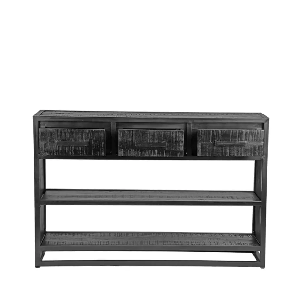 De karakteristieke sidetable Chili in de kleur zwart is gemaakt van mangohout en metaal. Het meubel heeft een gave balans in materiaal; een basisframe uitgevoerd in zwart metaal met verder alle zijdes uitgevoerd in zwart mangohout. De fraaie, zichtbare houtnerven zorgen voor een individueel karakter met charme. Het meubel heeft twee royale open ruimtes en drie lades, om genoeg op te kunnen bergen. De lades zijn voorzien van stijlvolle, strakke metalen greepjes in de kleur zwart wat het geheel helemaal afmaakt.