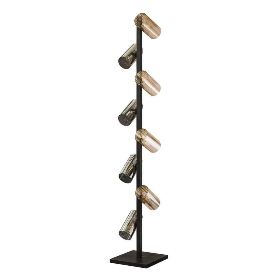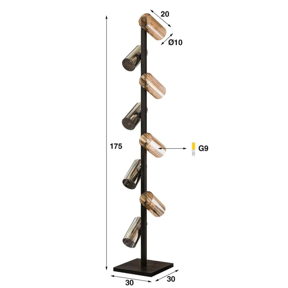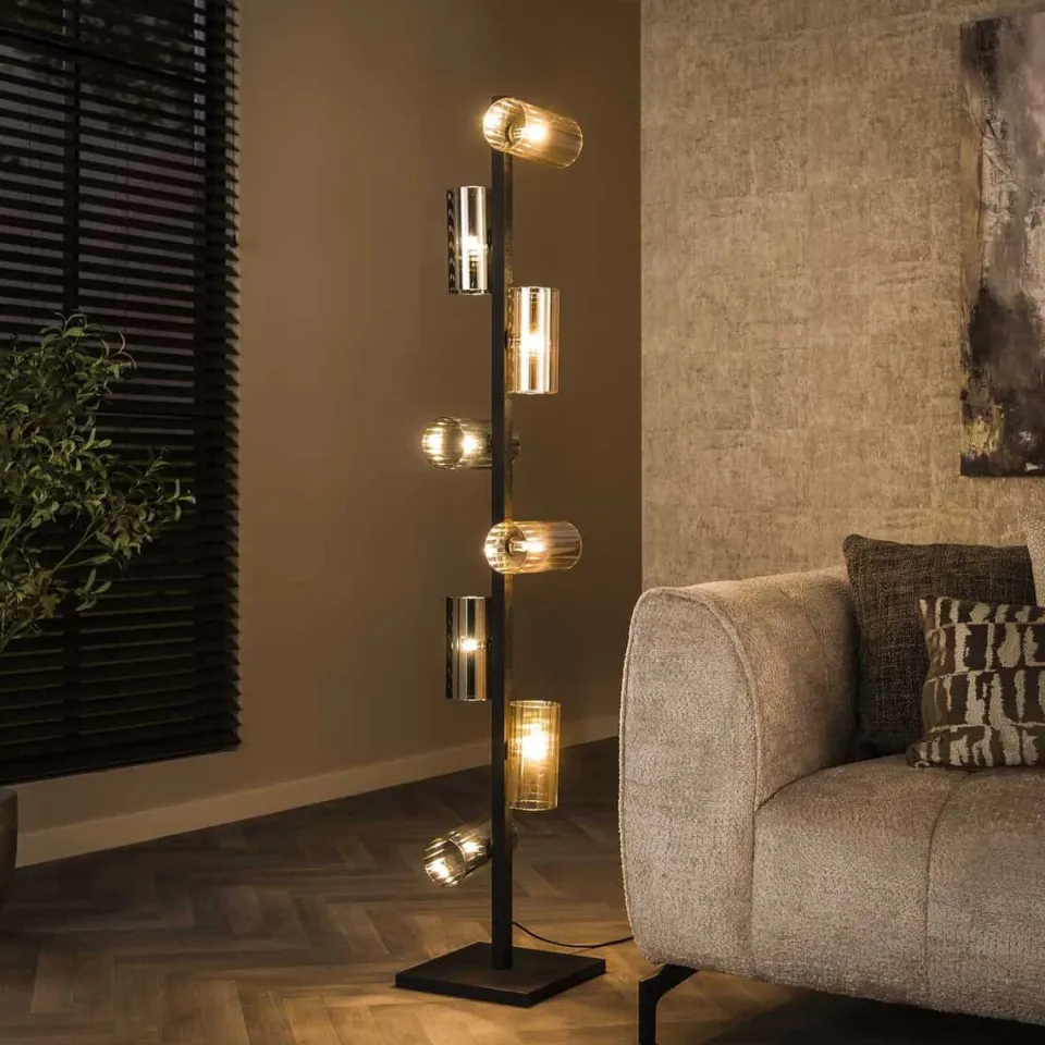 Deze prachtige vloerlamp Vinny is uitgevoerd met 8 glazen kapjes. De kapjes zijn afgewerkt in amberkleurig en chrome kleurig glas. De kapjes kunnen naar eigen inzicht gedraaid worden. De metalen delen van de lamp zijn afgewerkt in een artic black finish. Deze lamp heeft ook nog 2 bijpassende hanglampen.