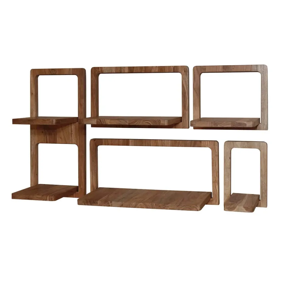 Wandschap Tyrone is een set van 5 wandplanken, gemaakt van massief acaciahout en afgewerkt met een matte, transparante lak die de natuurlijke houtstructuur goed zichtbaar laat. De afgeronde hoeken geven de planken een verfijnde uitstraling. Elke plank is voorzien van twee metalen oogjes voor eenvoudige wandmontage. De set kan op verschillende manieren worden geplaatst, bijvoorbeeld als een rechthoekige compositie of in een vrije opstelling.