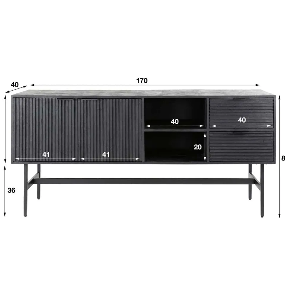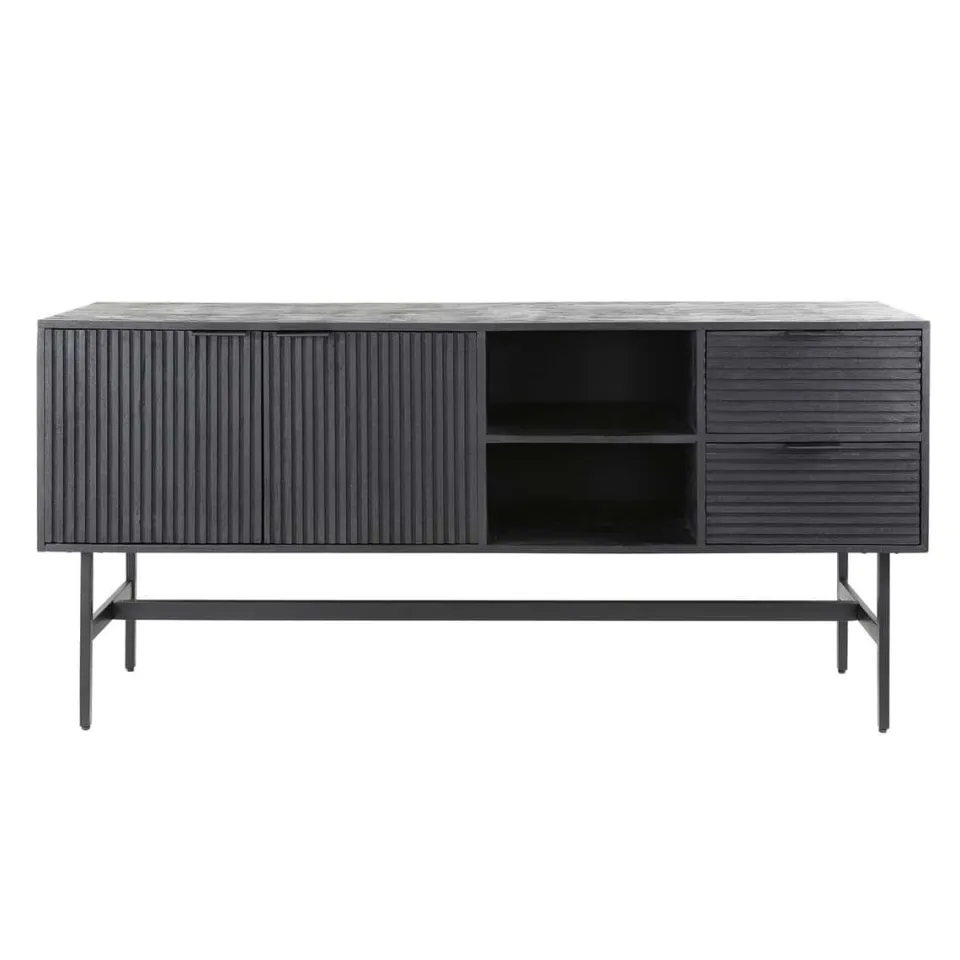 Dit dressoir Mario is uitgevoerd in mangohout met een zwarte finish. Het dressoir beschikt over 2 kastdeuren, een open vak met twee schappen en twee lades. Het mangohout is erg glad geschuurd, waardoor er een vlak oppervlakte is ontstaan.