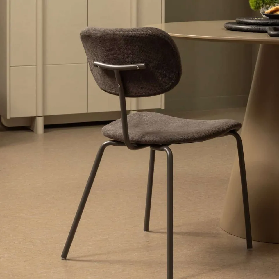 Eetkamerstoel Link van WOOOD Exclusive is een elegante stoel met een modern karakter. De kuipzitting is bekleed met een zachte, matglanzende ribstof uit de Ella-serie: een geweven stof met fluweelachtige grip en een speels banenpatroon. De subtiele kleurnuances en zichtbare diepte in de stof geven de stoel een rijke uitstraling. Het ranke metalen onderstel in bruin-grijze poedercoating maakt Link tot een stijlvolle en luchtige verschijning aan iedere eettafel.