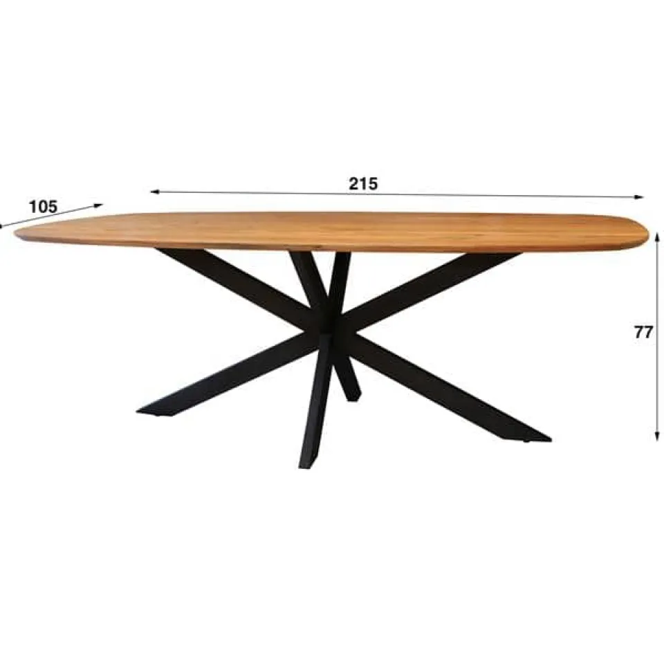 Deze prachtige eetkamertafel is uitgevoerd in massief acaciahout. Er is voor een Deens ovaal blad gekozen met een spider frame. Echt een eye-catcher! Afgebeeld de 215 cm variant.