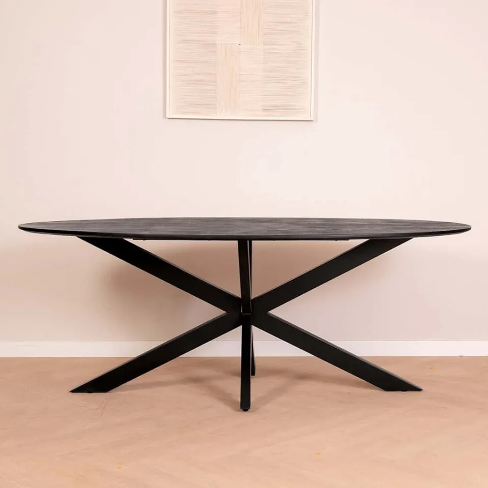 Het tafelblad is gemaakt van mangohout en heeft een natuurlijke nerf met een warme uitstraling. Dit geeft de tafel karakter en maakt elk exemplaar uniek. Je kunt kiezen uit een naturel of zwarte afwerking. Zo stem je de tafel eenvoudig af op jouw interieur, van licht en luchtig tot krachtig en contrastrijk.