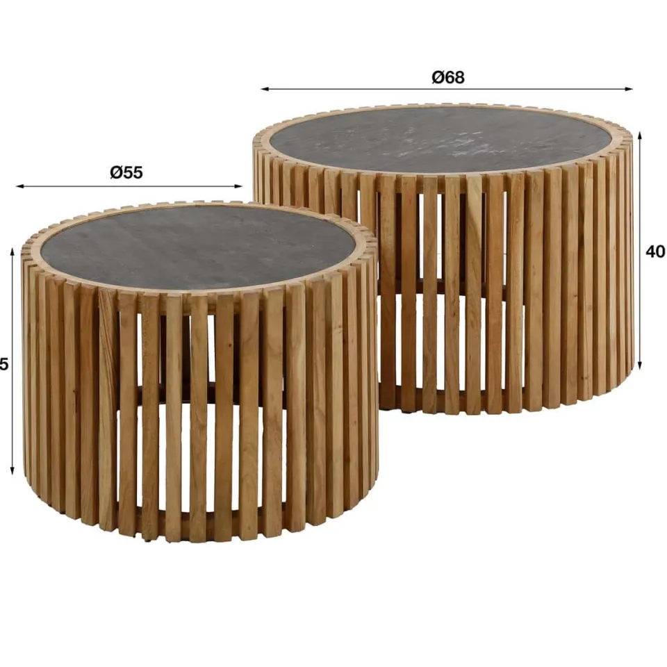 Deze ronde salontafel set van 2 ‘slate’ is uitgevoerd in leisteen met een acaciahouten frame. Het leisteen is met een dunne laag aangebracht, waardoor het haar prachtige uitstraling krijgt, maar ook nog een comfortabel gewicht houdt. Een tijdloze set passend voor ieder interieur! De grootste tafel heeft een diameter van 68 centimeter en een hoogte van 40 centimeter en de kleinere tafel heeft een diameter van 55 centimeter en een hoogte van 35 centimeter.