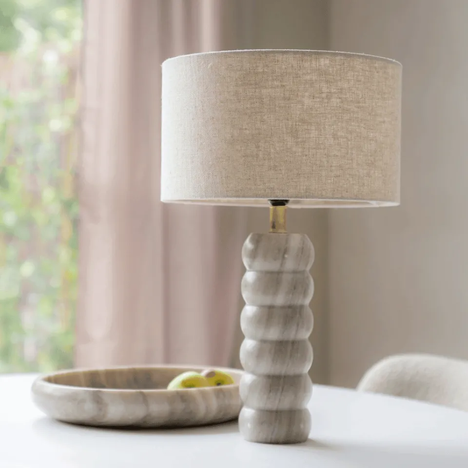De Patron tafellamp straalt een serene en verfijnde sfeer uit. Met een prachtige combinatie van natuurlijke materialen is deze lamp een echte blikvanger in je interieur. De kap, gemaakt van viscose linnen in een naturel/zandkleurige tint, verspreidt een warm en sfeervol licht. Het marmeren voetstuk voegt een vleugje luxe toe en zorgt voor stabiliteit en duurzaamheid.