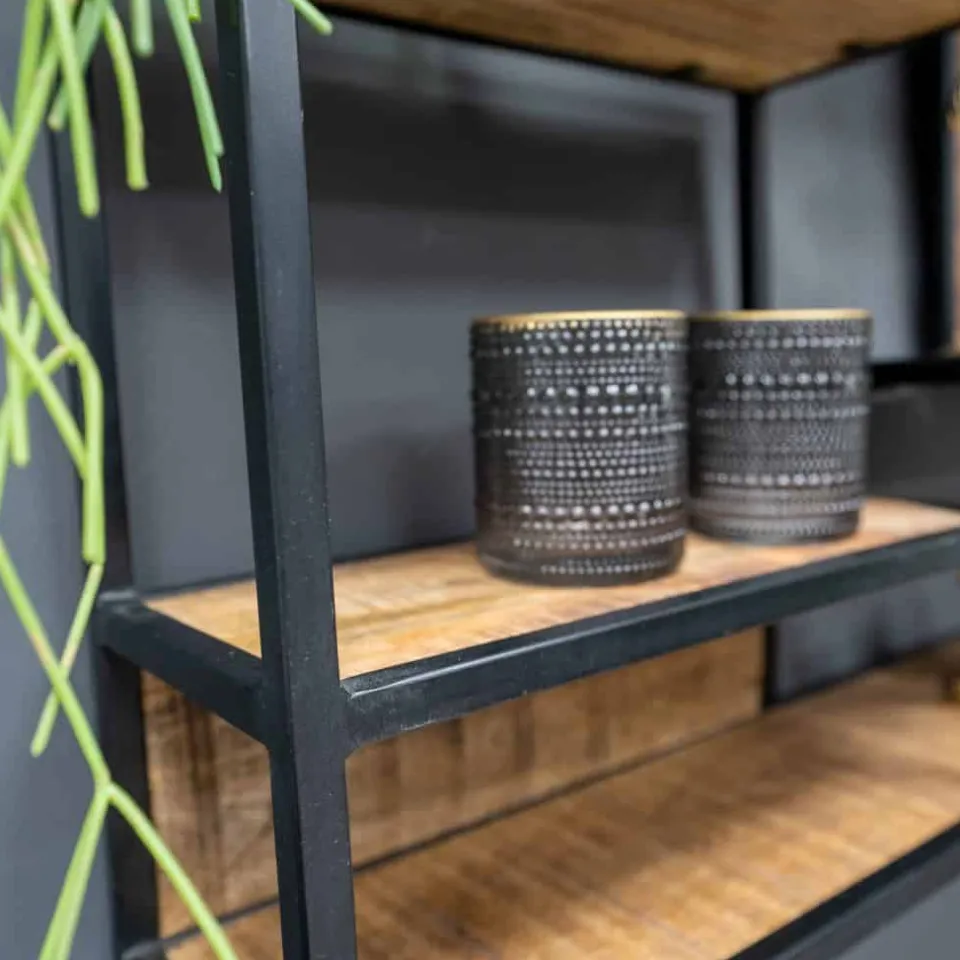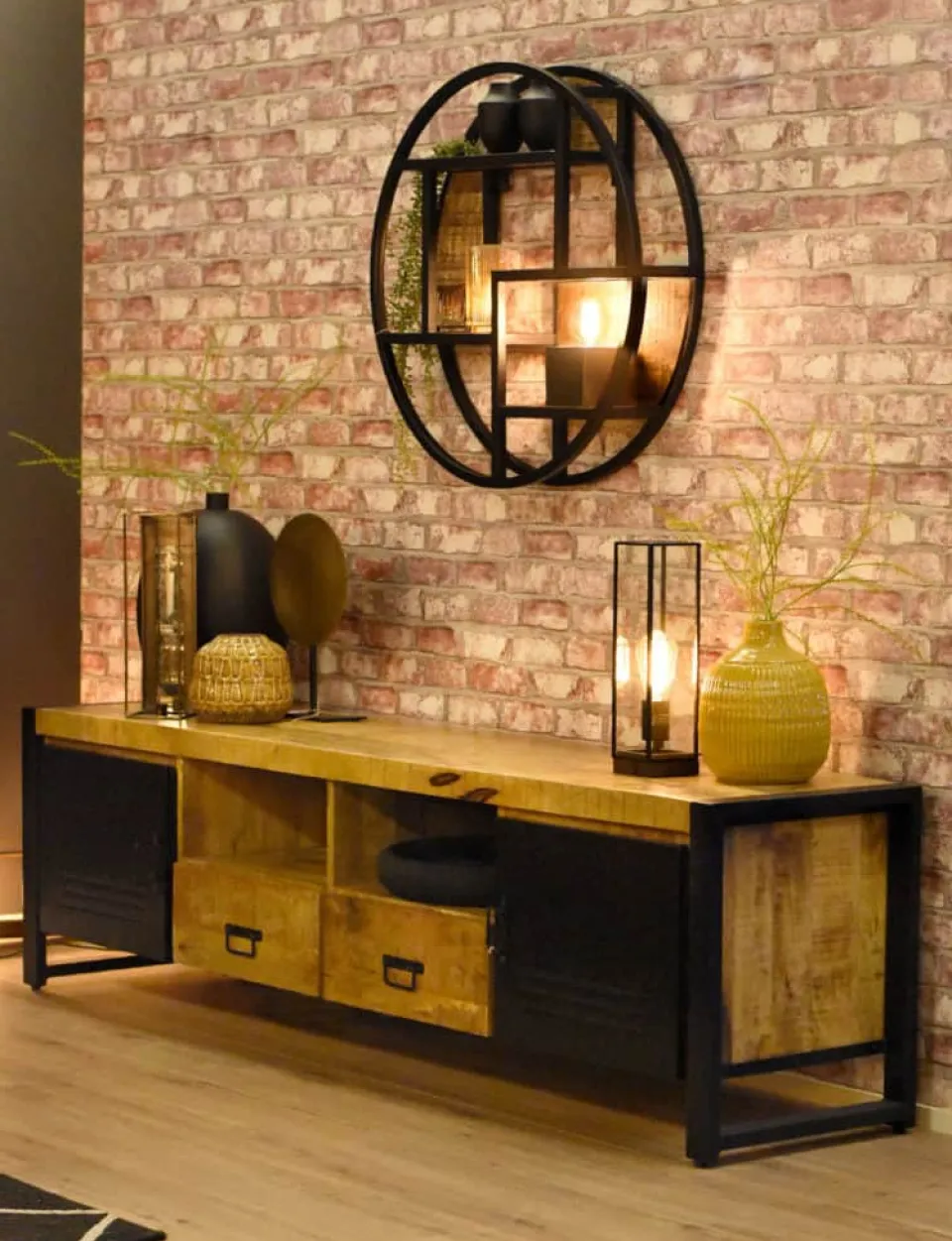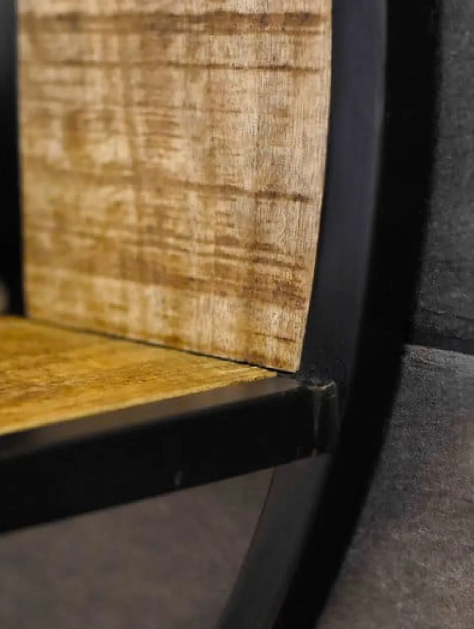 Ontdek het perfecte huwelijk van functionaliteit en stijl met het wandrek Jolande. Dit veelzijdige wandrek combineert de warmte van mangohout met de stoere elegantie van zwart metaal.