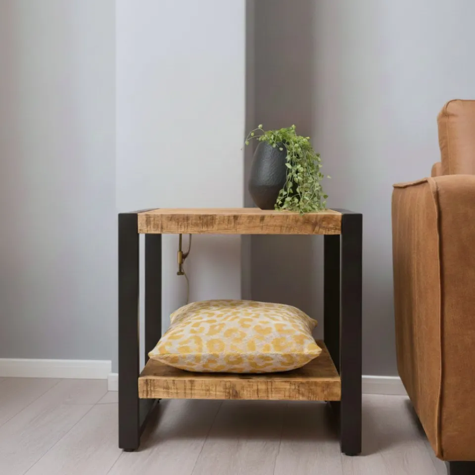 Bijzettafel Britt mangohout metaal HUUS collectie is een praktische en stijlvolle aanvulling voor je interieur. De combinatie van warm mangohout en een stevig zwart metalen frame geeft deze bijzettafel een robuuste, industrieel-moderne uitstraling die prachtig staat naast een bank, in de hal of zelfs als nachtkastje. Hij is verkrijgbaar in twee varianten — eentje met een minimalistische plank en eentje met twee planken voor extra opbergruimte.
