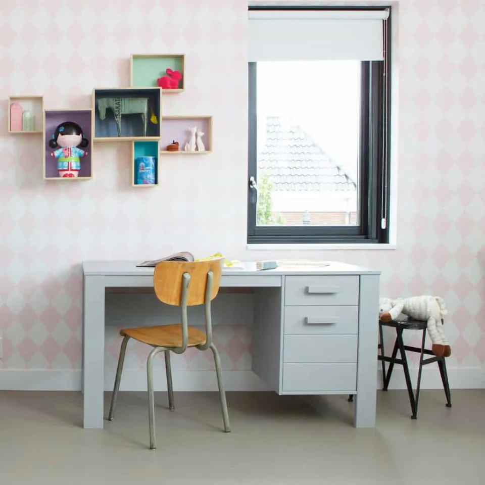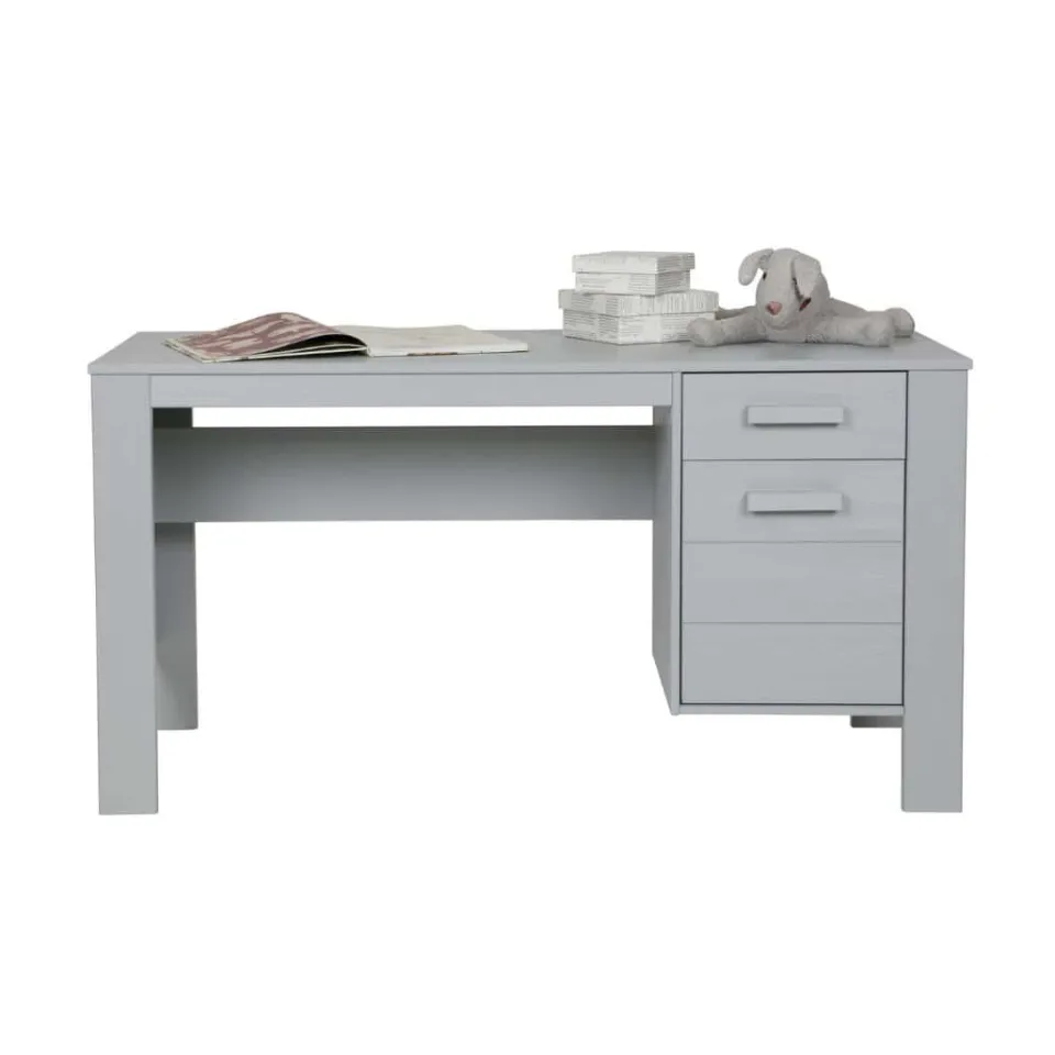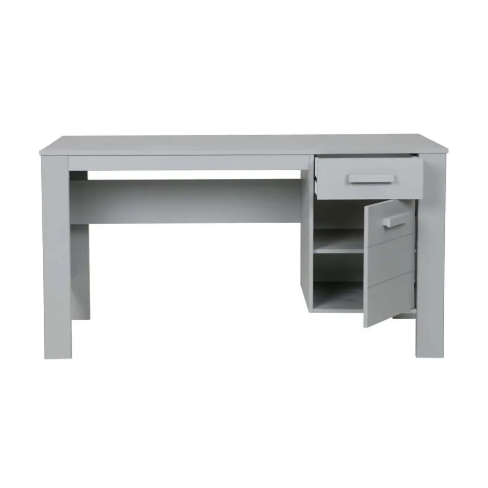 Stoer bureau met ingebouwde lade en kastje gespoten in de kleur betongrijs en donkergrijs. Het bureau is gemaakt van grenen en heeft een geborstelde afwerking.
