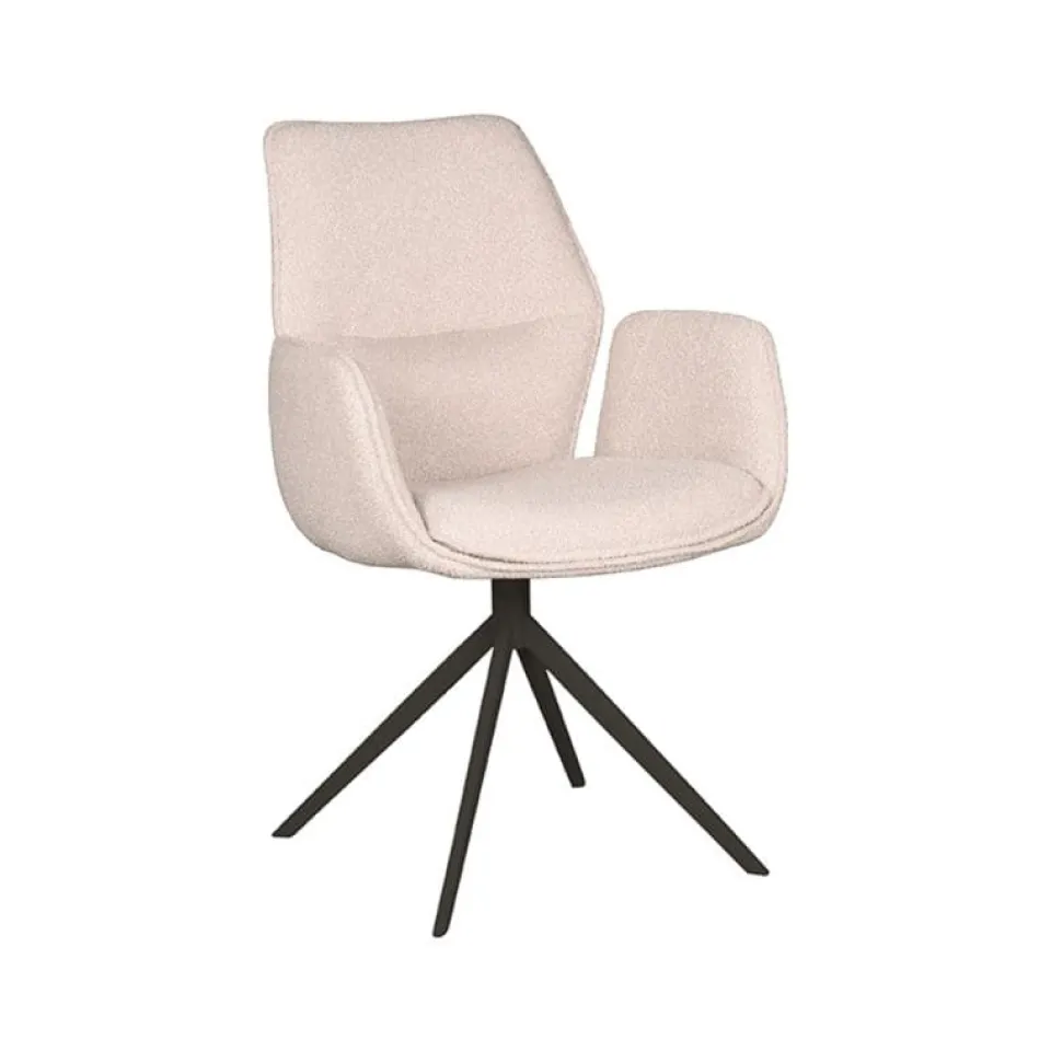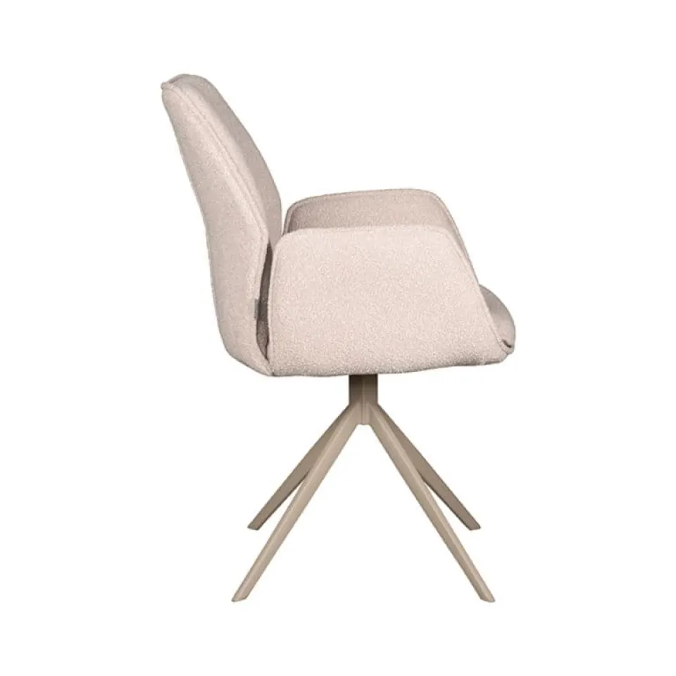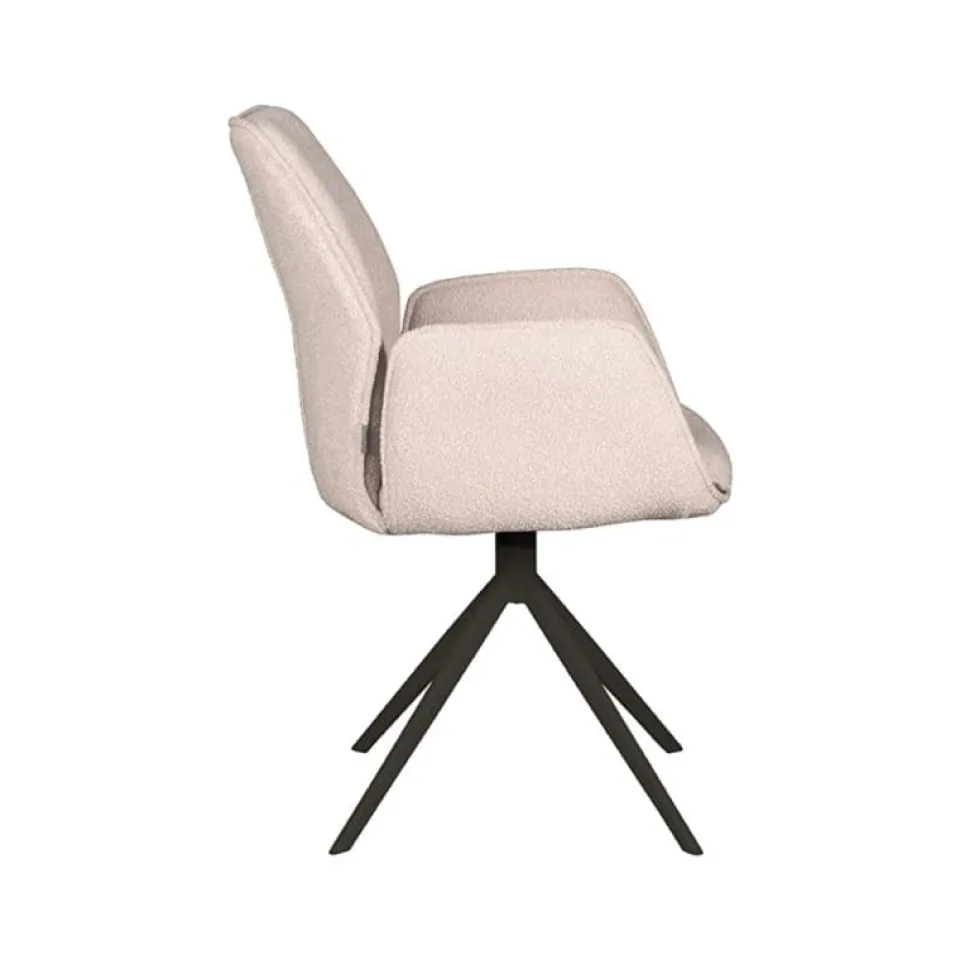 Eetkamerstoel Mellow van LABEL51 is een stijlvolle draaistoel met een zachte uitstraling en hoog comfortniveau. De zitting is bekleed met bouclé in de kleur Naturel Touch en heeft een uniek vormgegeven armleuning die de stoel extra karakter geeft. Het draaibare onderstel is uitgevoerd in zwart of taupe metaal en zorgt voor een moderne, stabiele basis. Dankzij het neutrale ontwerp past Mellow moeiteloos in zowel rustige als kleurrijke interieurs, van strak modern tot sfeervol Scandinavisch.