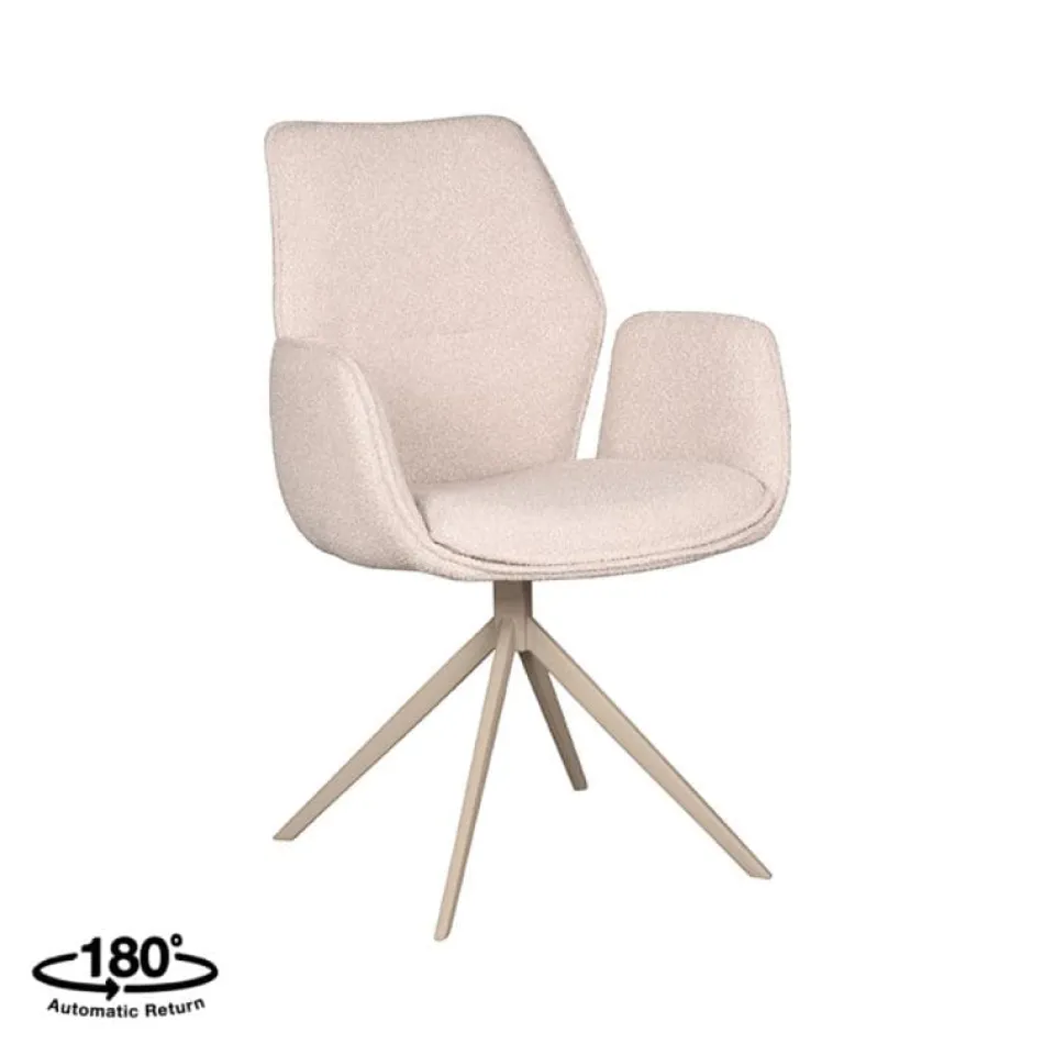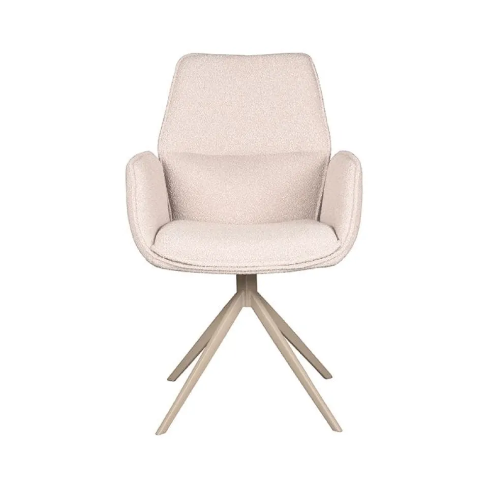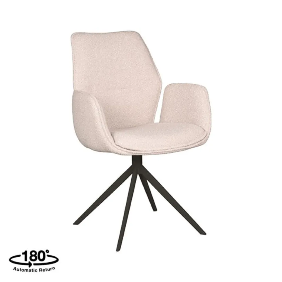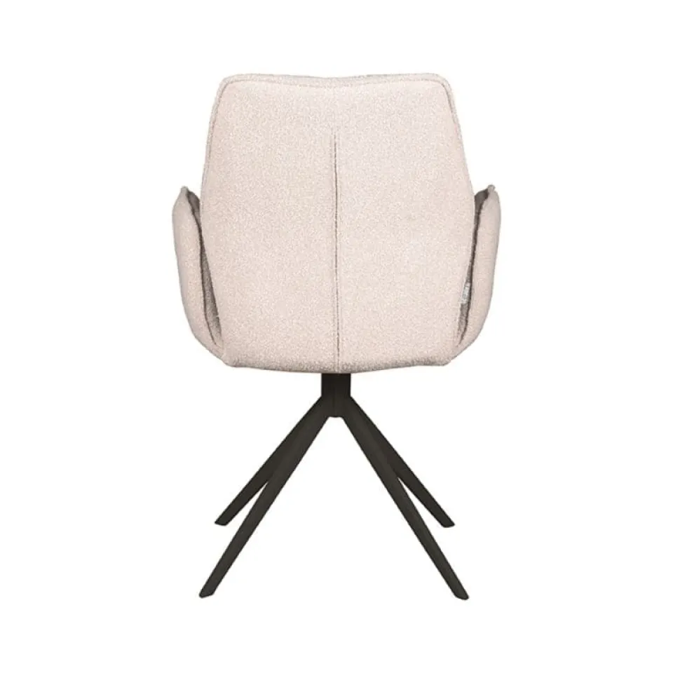 Eetkamerstoel Mellow van LABEL51 is een stijlvolle draaistoel met een zachte uitstraling en hoog comfortniveau. De zitting is bekleed met bouclé in de kleur Naturel Touch en heeft een uniek vormgegeven armleuning die de stoel extra karakter geeft. Het draaibare onderstel is uitgevoerd in zwart of taupe metaal en zorgt voor een moderne, stabiele basis. Dankzij het neutrale ontwerp past Mellow moeiteloos in zowel rustige als kleurrijke interieurs, van strak modern tot sfeervol Scandinavisch.