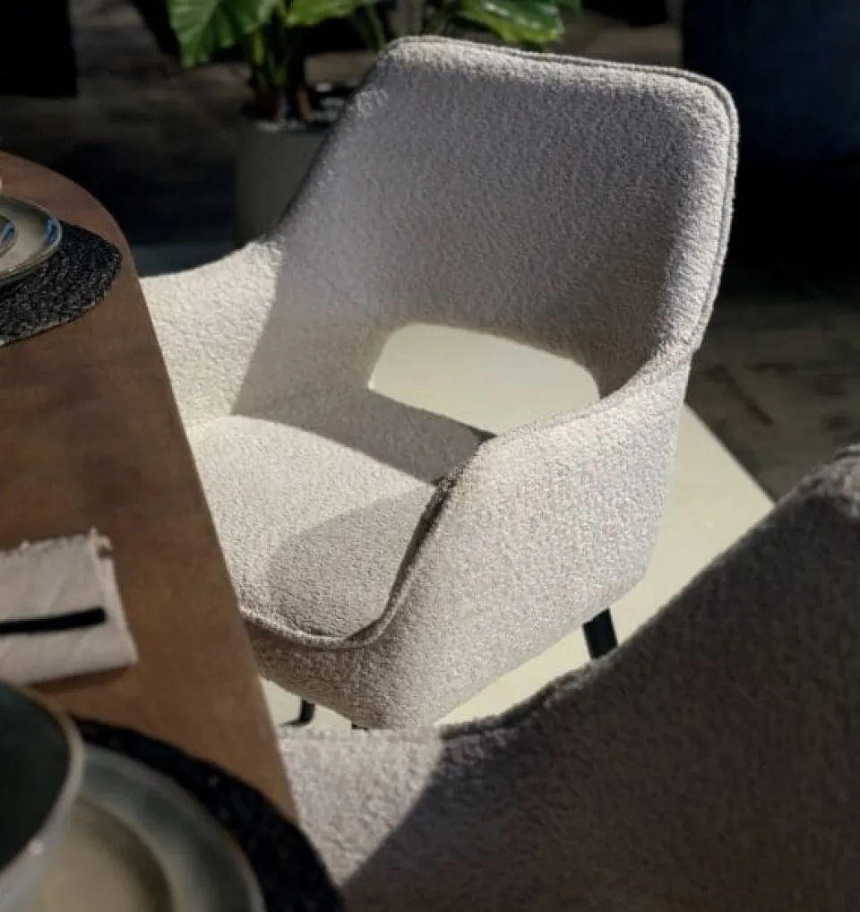 Om de stof mooi te houden, raden we aan de stoel regelmatig te stofzuigen met een zachte meubelborstel. Voor extra bescherming tegen vlekken kun je een textiel impregneerspray gebruiken. Viltjes of dopjes onder de poten helpen je vloer te beschermen tegen krassen.