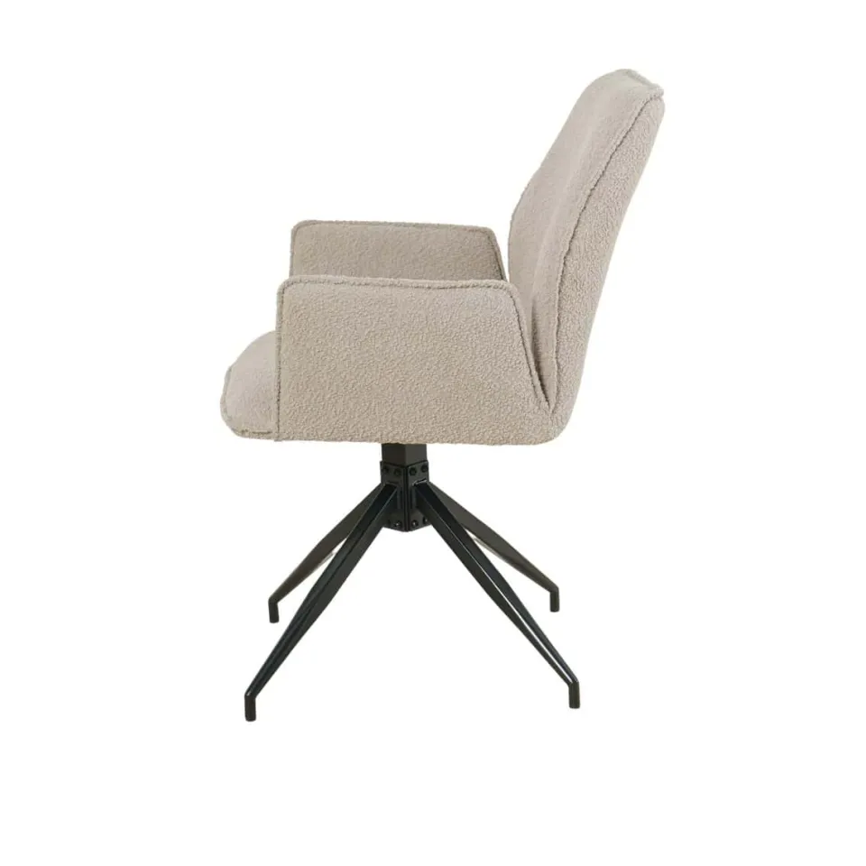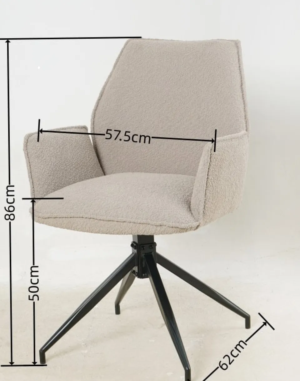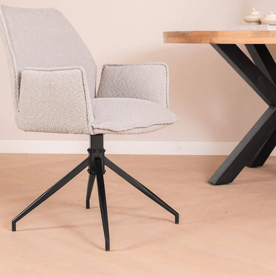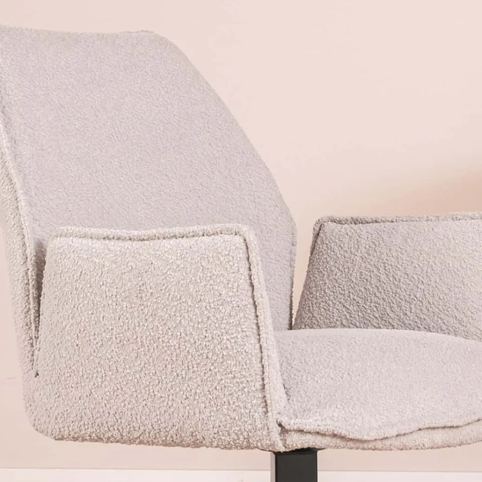 De Eetkamerstoel Vermeer van HUUS combineert comfort met een stijlvolle uitstraling. Bekleed met zachte bouclé-stof in een beige/grijze tint, biedt deze stoel een aangename zitervaring. Met afmetingen van 57,5 × 62,5 × 86 cm en een zithoogte van 50 cm is de Vermeer ideaal voor lange diners of gezellige avonden aan tafel. De ruime afstand van 62 cm tussen de poten zorgt voor stabiliteit en stijl. Let op: de kleur kan iets donkerder uitvallen dan op de foto, afhankelijk van het lichtinval.